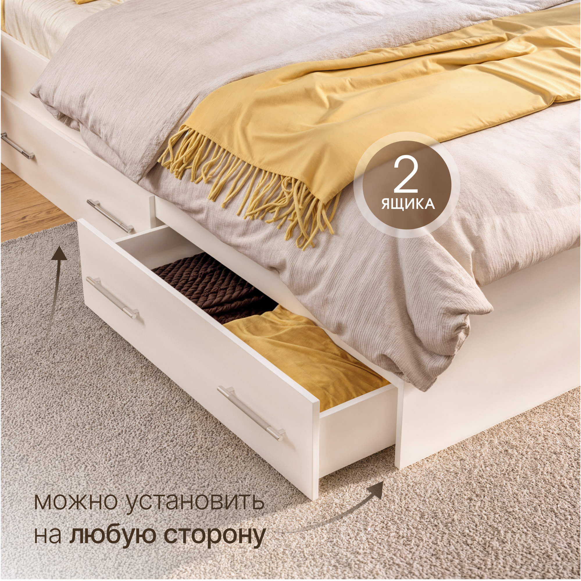 Кровать двуспальная Пора Спать Арина с ящиками и основанием ДСП, белая, спальное место: 200х160 см, габариты: 220х167 см информация: