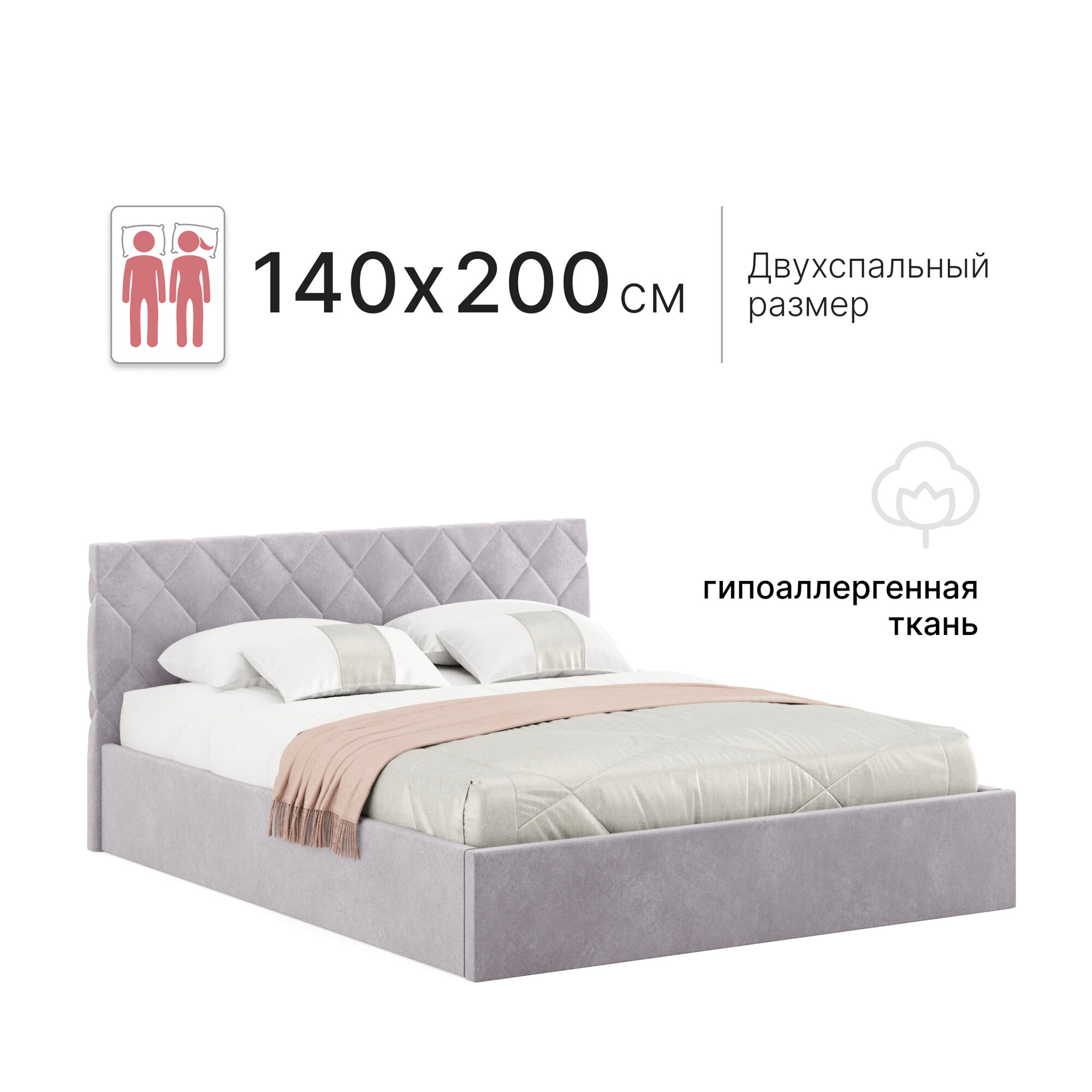 Кровать 140х200 с подъемным механизмом двуспальная Техас с ортопедическим основанием и ящиком для белья, велюр лиловый информация: