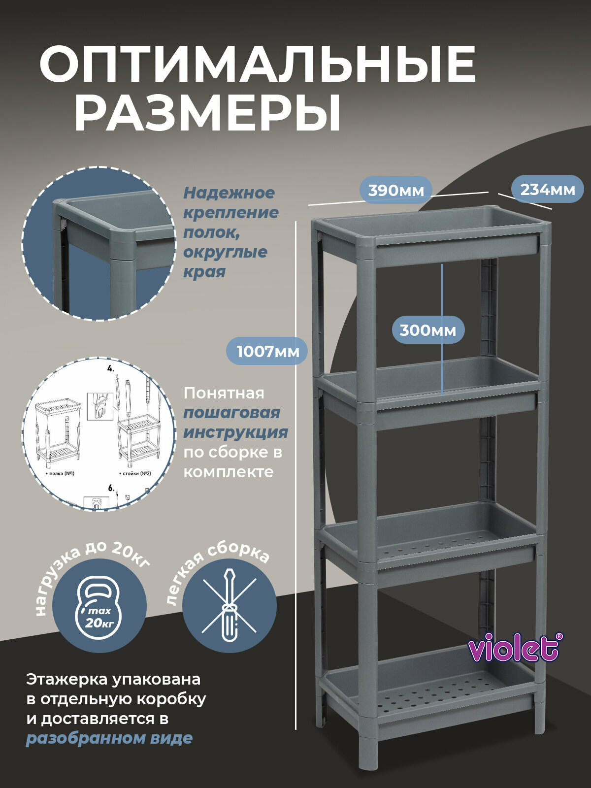 Отзывы на Этажерка Violet для хранения 4х ярусная VIKEA широкая, цвет серый / стеллаж для кухни и ванной