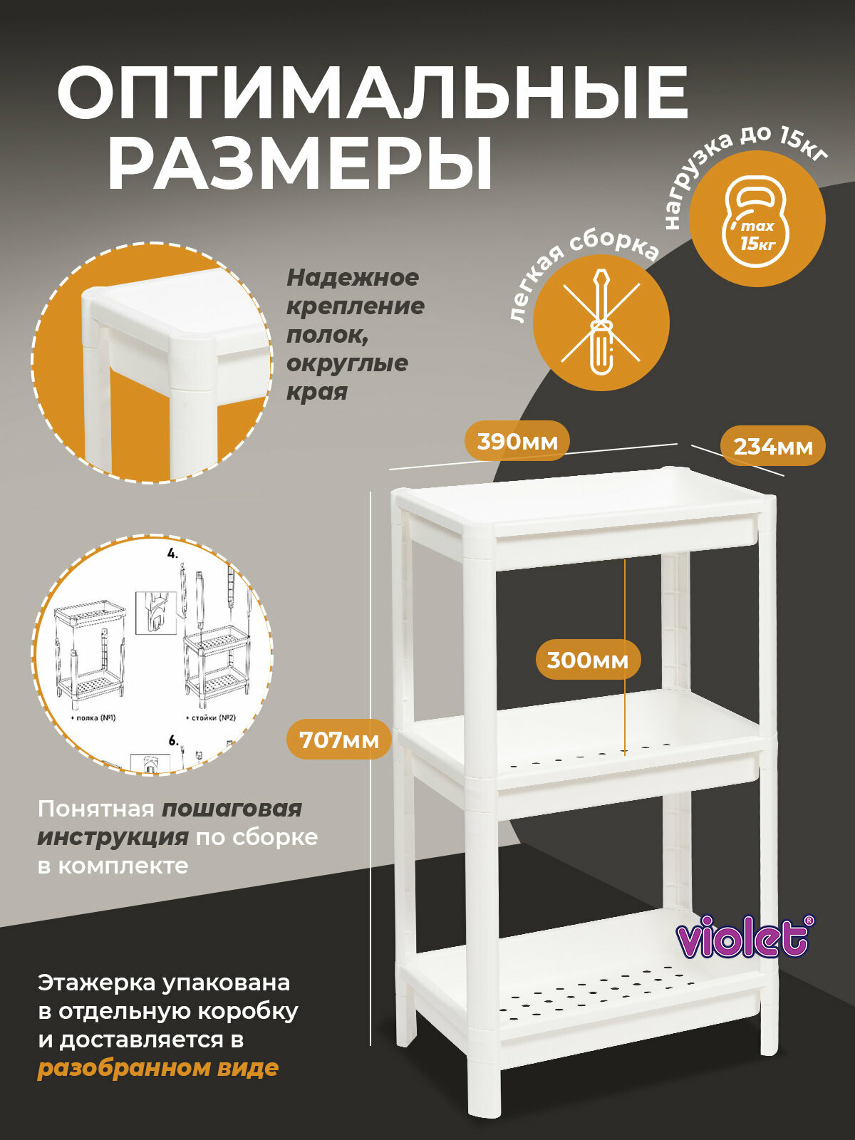 10 цен на Этажерка Violet для хранения 3х ярусная VIKEA широкая, цвет белый / стеллаж для кухни и ванной