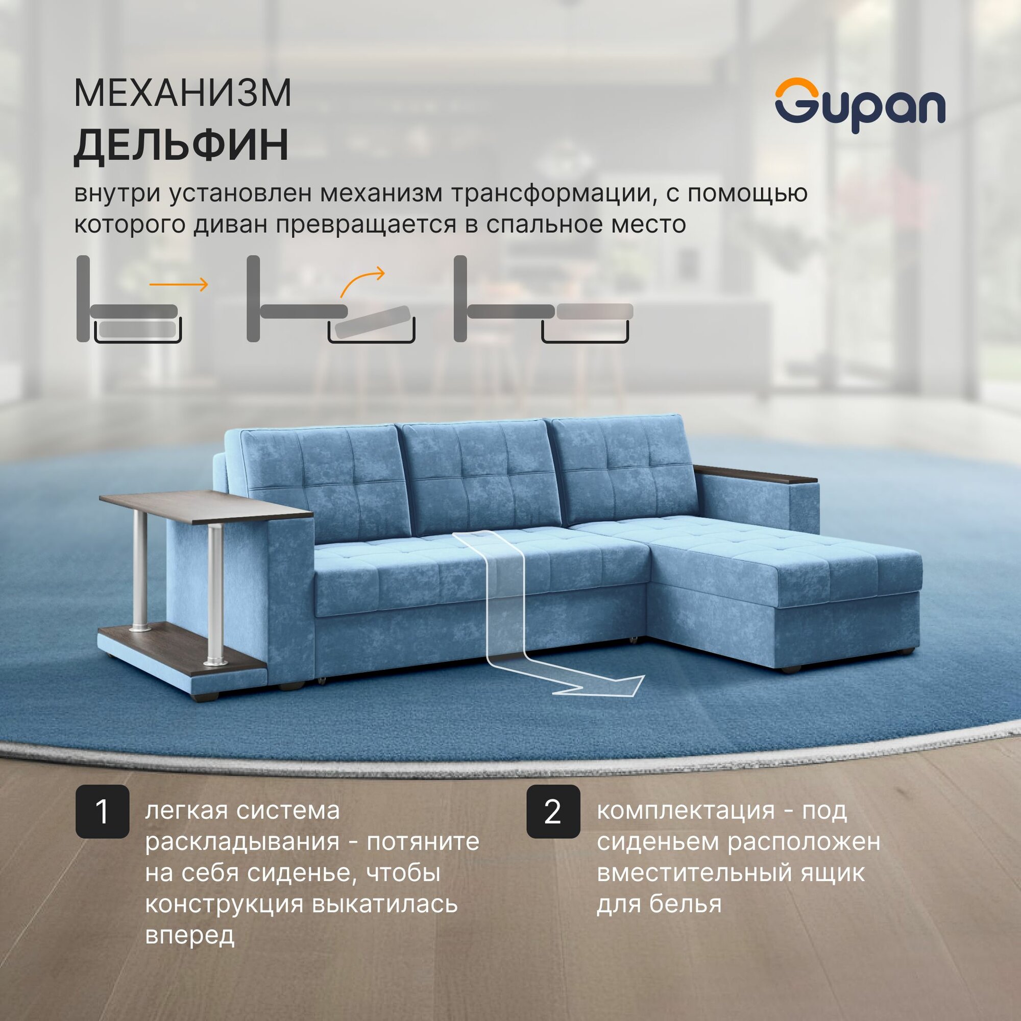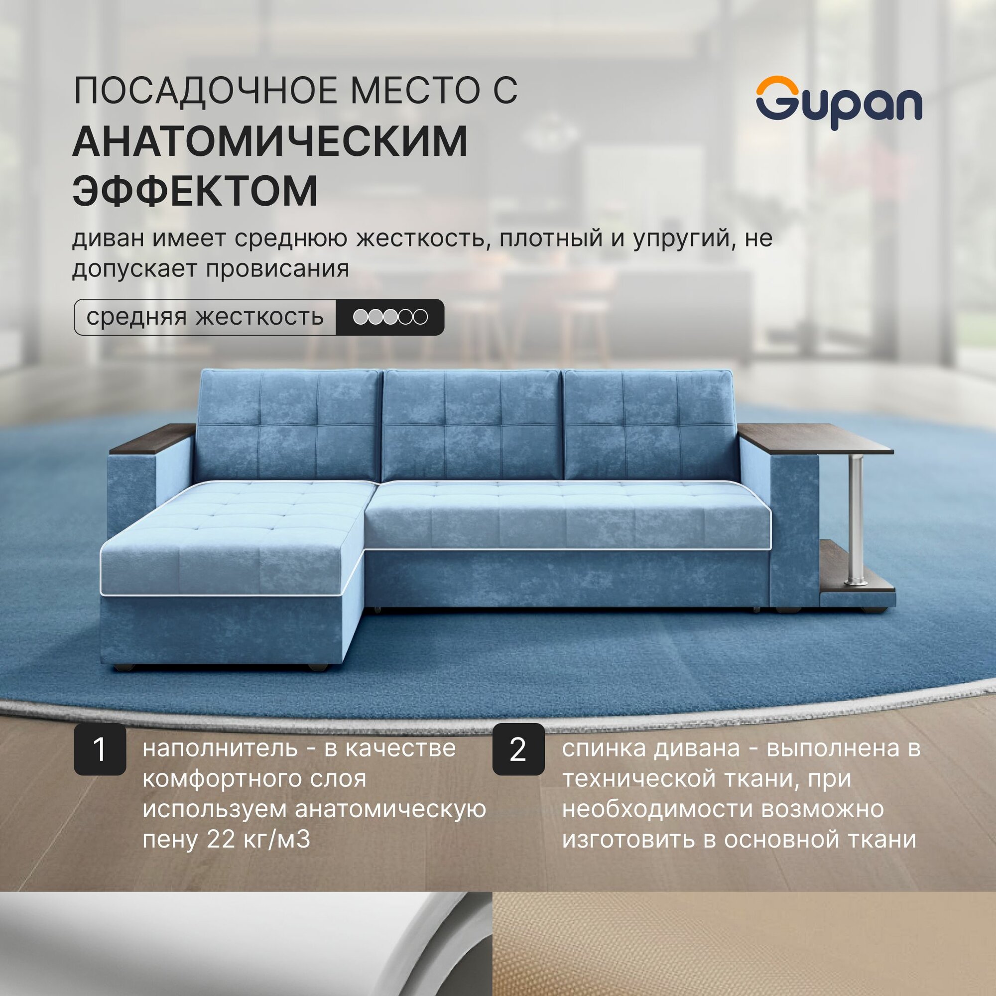 10 цен на Диван угловой Gupan Атланта Классик Хит / Люкс со столом Велюр Bingo Blue, раскладной, механизм дельфин, беспружинный, с ящиком для белья