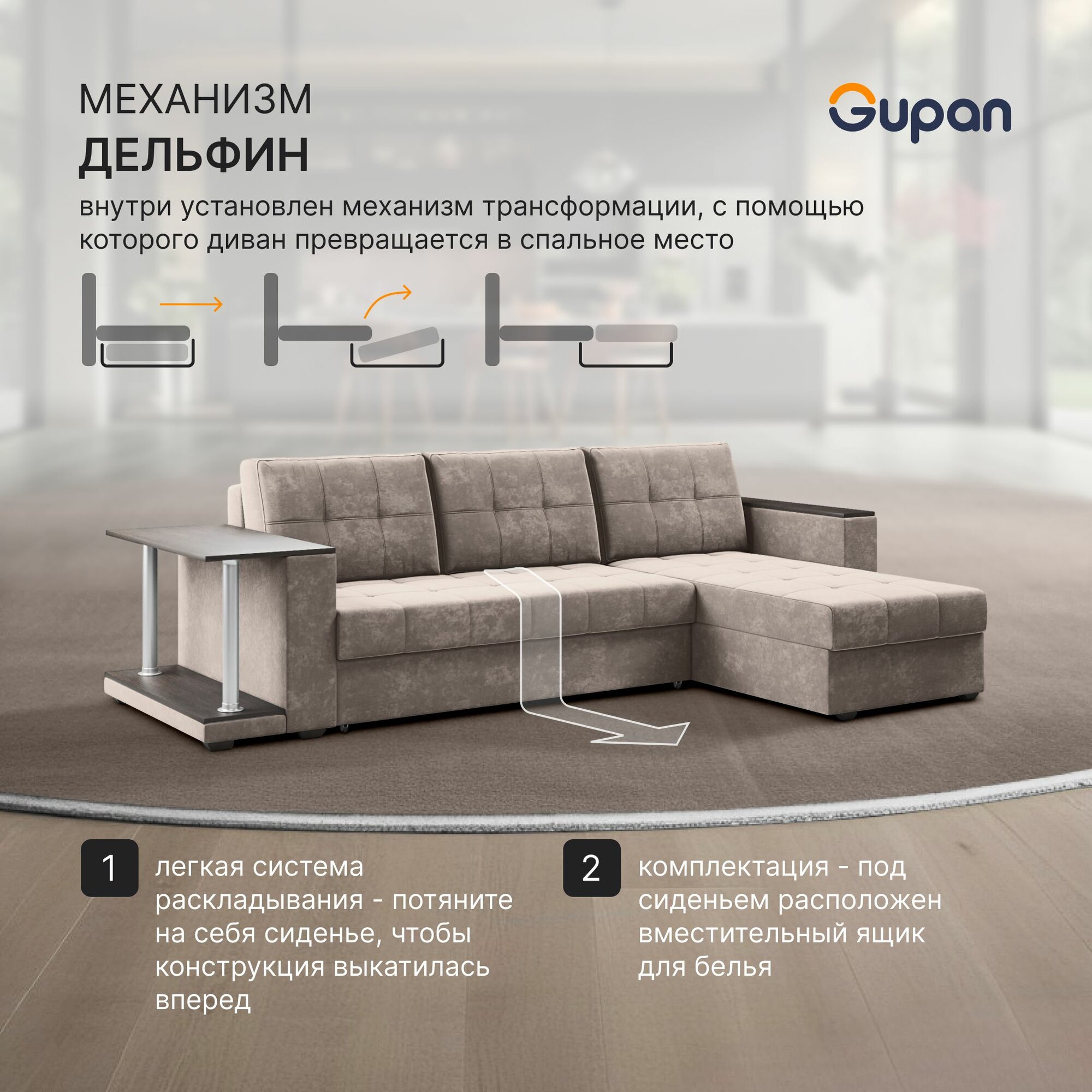 Диван угловой Gupan Атланта Классик Хит / Люкс со столом Велюр Bingo Desert, раскладной, механизм дельфин, беспружинный, с ящиком для белья 40 992 ₽