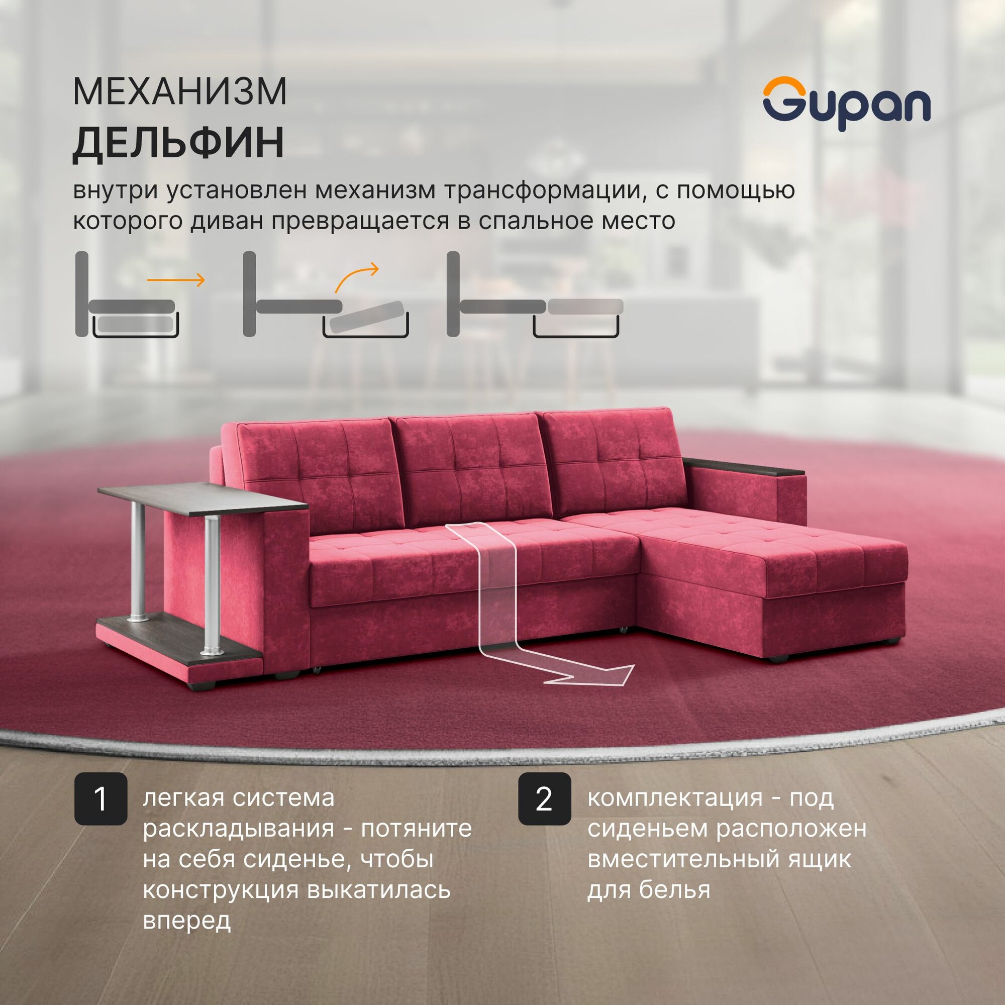 Диван угловой Gupan Атланта Классик Хит / Люкс со столом Велюр Bingo Berry, раскладной, механизм дельфин, беспружинный, с ящиком для белья информация:
