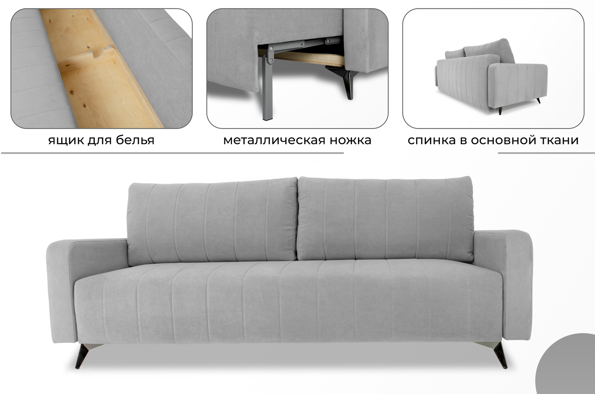 | Особенности | пружинный блок, раскладная конструкция, с подлокотниками, съемный чехол, ящик для белья |