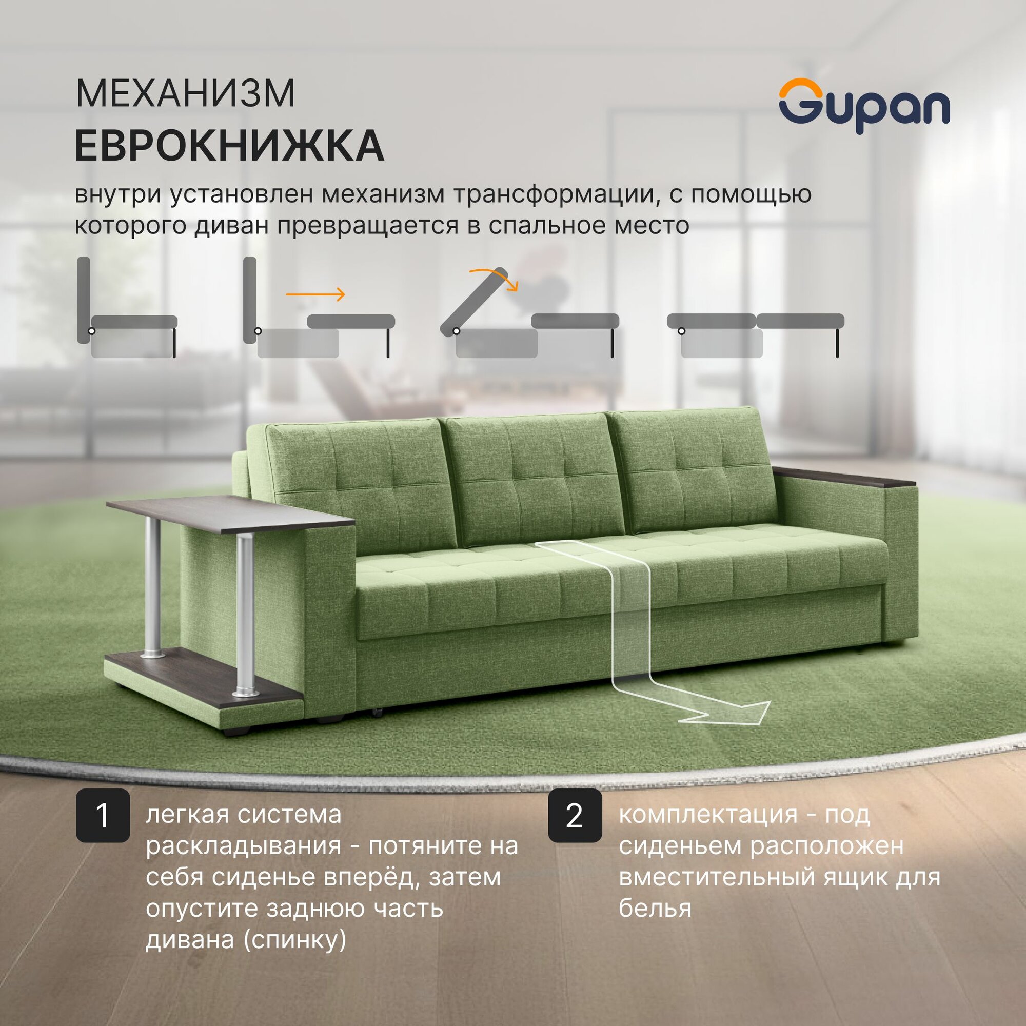 10 цен на Диван кровать Gupan Атланта Классик Люкс со столом Рогожка Savana Green, раскладной, механизм еврокнижка, беспружинный, с ящиком для белья