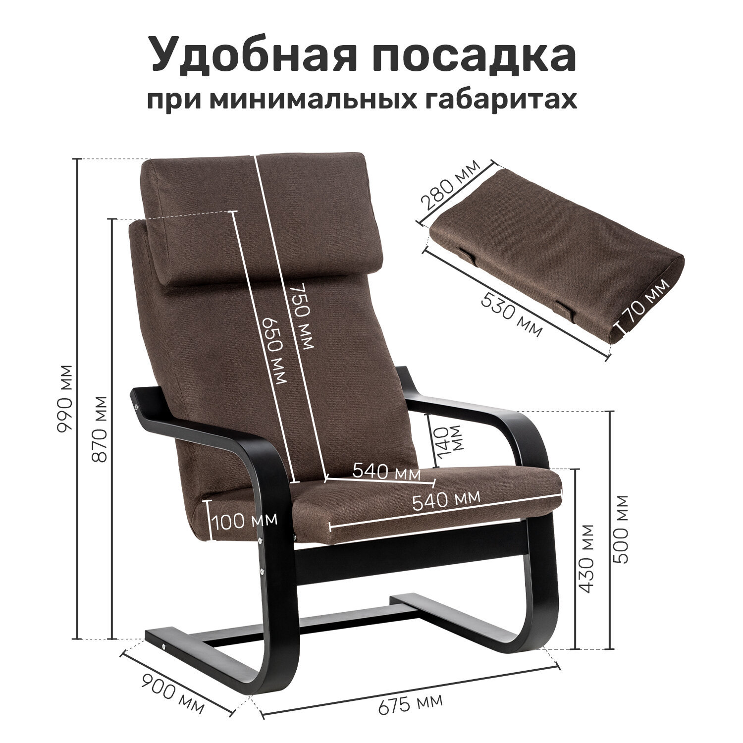 | Дополнительная информация | Высота от пола до сиденья — 430 Ширина подлокотника — 70 мм. Толщина мягкого элемента — 100 мм. Высота подлокотников от пола — 500 мм. Высота от сиденья до подлокотника— 100/140 мм. Размер подушки под голову — 530x280x70 мм. Наполнитель: поролон марки ST 1828, высшего сорта, толщиной 80мм. Ширина сиденья — 540 Глубина сиденья — 540 Высота спинки (с подушкой) — 750 Высота спинки (без подушкой) — 646 |