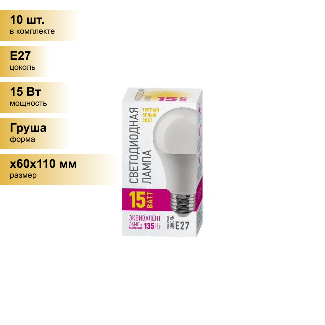 Светодиодная LED лампа онлайт ЛОН А60 E27 15W (1300lm) 2700K 2K 110x60 OLL-A60-15-230-2.7K-E27-PROMO, 82920 (упаковка 10 штук) информация:
