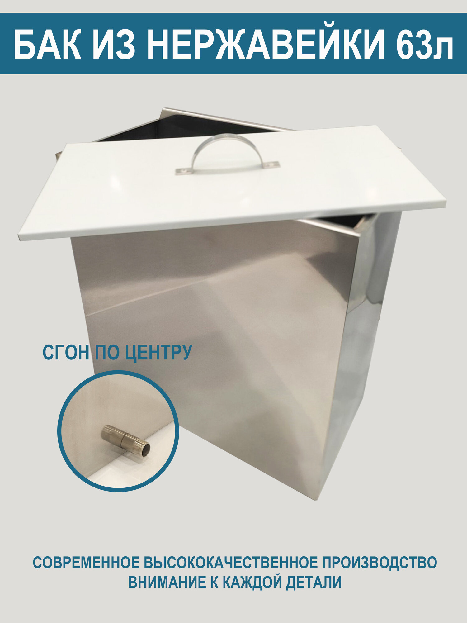 Бак из нержавеющей стали AiSi430 с крышкой, объем 63 литра, сгон по центру информация: