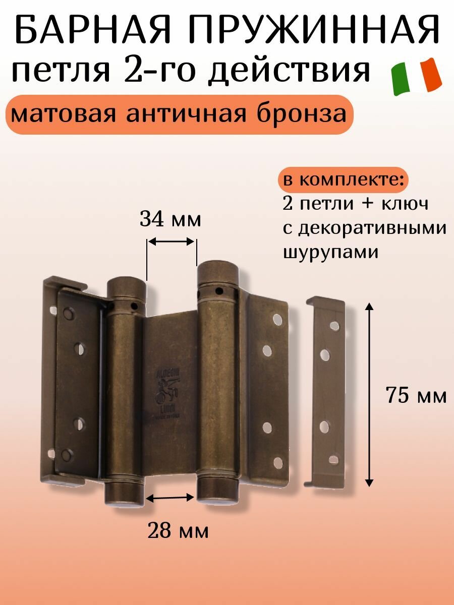 10 цен на Барная пружинная петля двойного действия ALDEGHI LUIGI SpA 75х34х28 мм, матовая античная бронза, к-т: 2 шт + ключ с декоративными заглушками, 101OS075B2