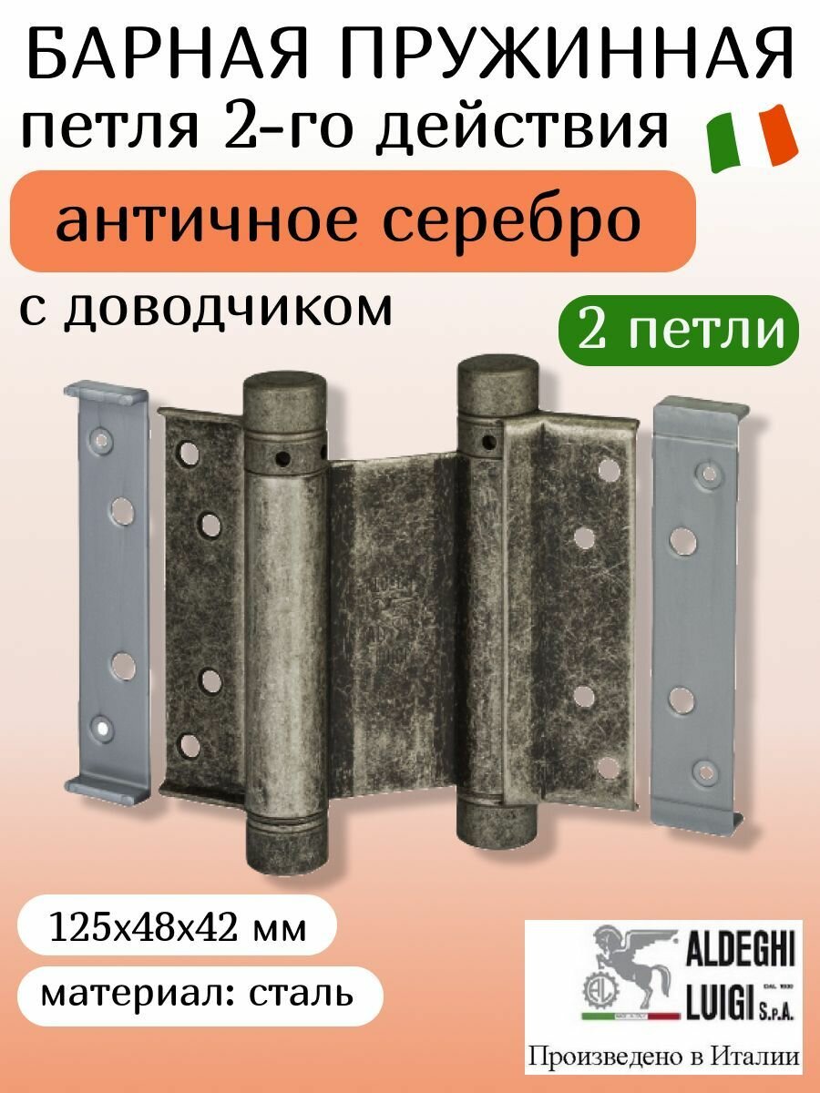 Барная пружинная петля двойного действия ALDEGHI LUIGI S.p.A. 125х48х42 мм, цвет: античное серебро, к-т: 2 шт + ключ с декоративными заглушками