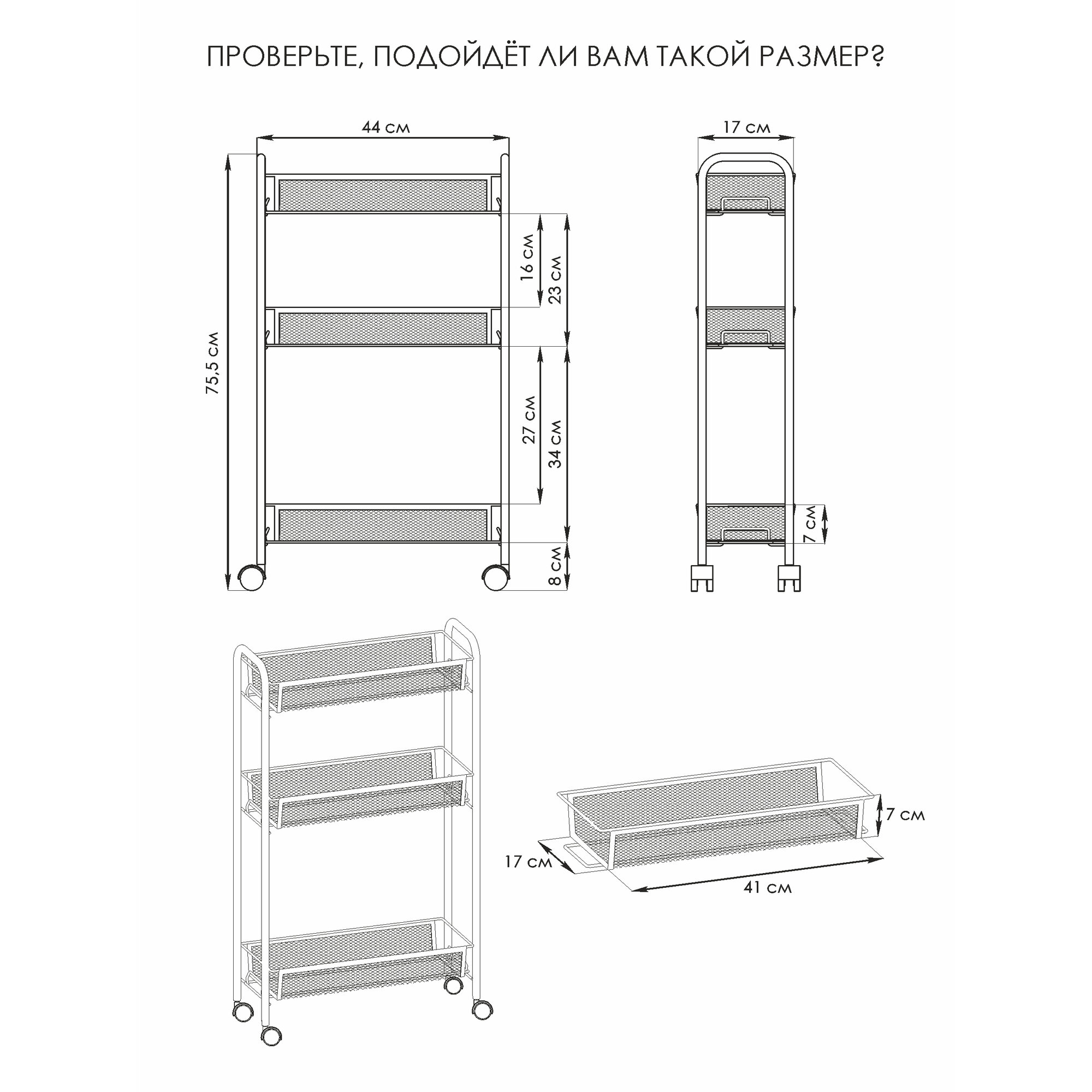 ЗМИ (Завод металлических изделий ООО) Этажерка ЗМИ Ладья 1К, 3 корзины, 44 x 17 x 75,5 см, на колесах, черная 1 618 ₽