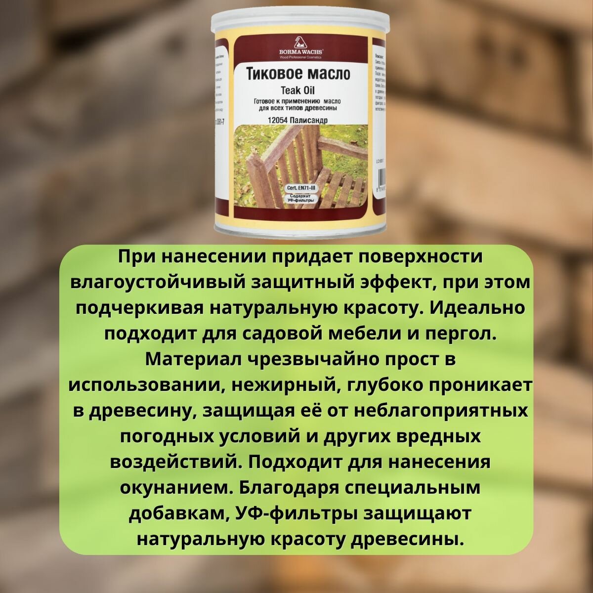 | Дополнительная информация | Подходит для всех типов древесины. Возможно нанесение окунанием. |