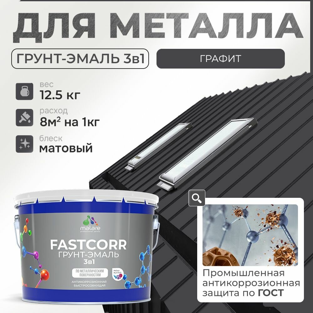 10 цен на Грунт-эмаль по ржавчине 3 в 1 Malare FastCorr краска для металла, антикоррозионная износостойкая быстросохнущая RAL 7024, графитово-серый(темный), матовая, 12,5 кг.