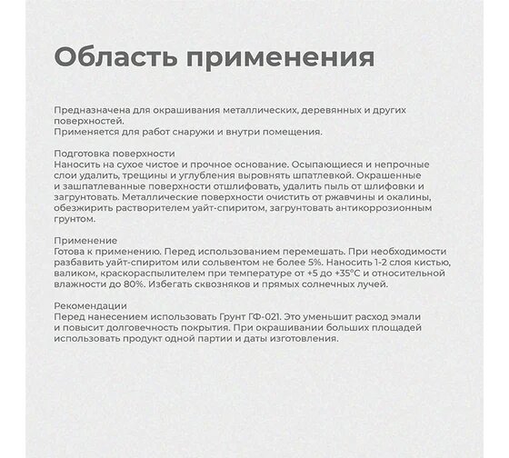 | Дополнительная информация | готова к применению, перед использованием перемешать, при необходимости разбавить уайт-спиритом или сольвентом не более 5%, наносить 1-2 слоя кистью, валиком, краскораспылителем при температуре от +5 до +35ºС и относительной влажности до 80% |