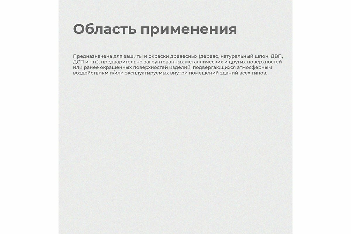 | Дополнительная информация | предназначена для защиты и окраски деревянных, предварительно загрунтованных металлических и других поверхностей; перед применением необходимо тщательно перемешать, в случае необходимости разбавить растворителем №646 |