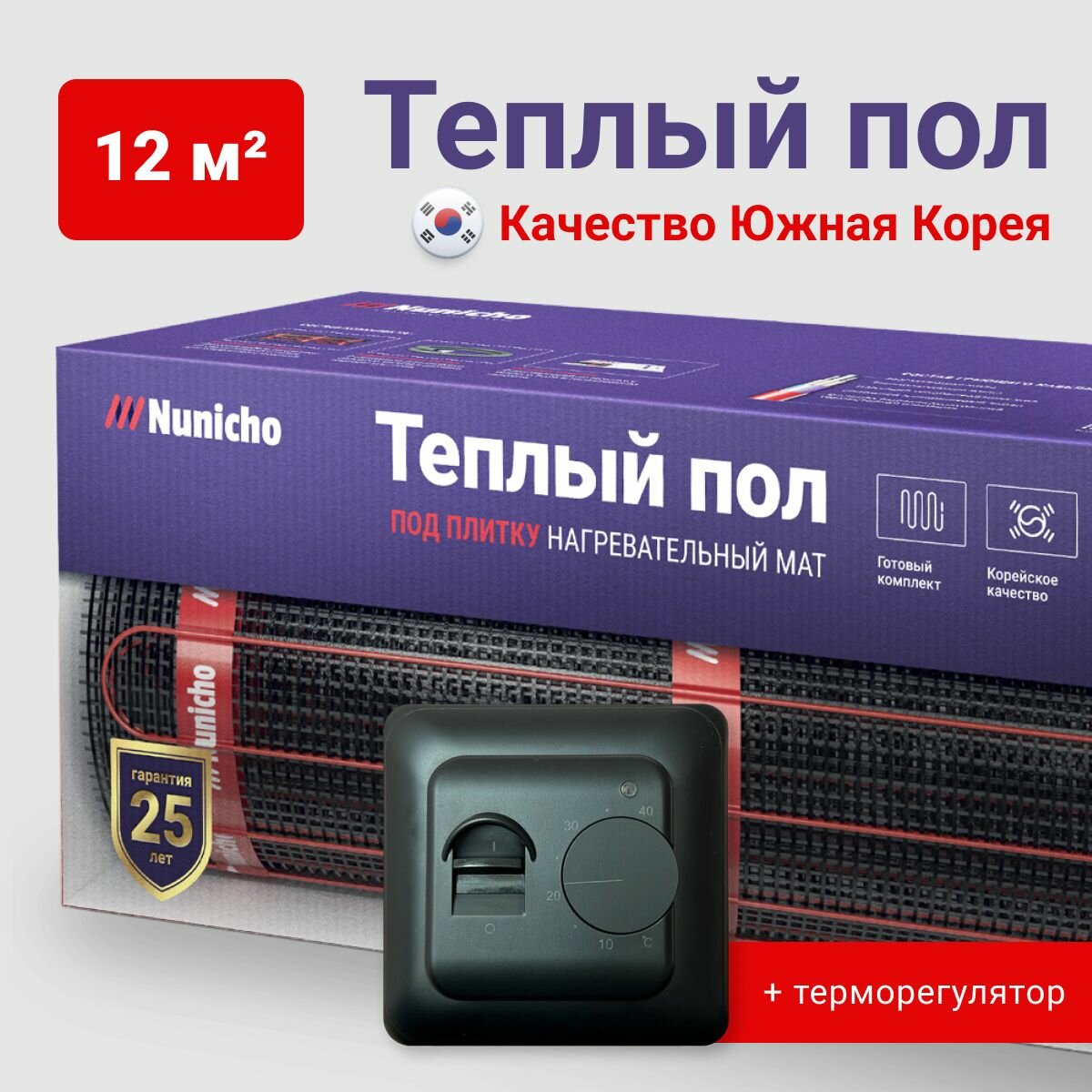 Теплый пол электрический под плитку 12 м2 Nunicho 150 Вт/м2 с терморегулятором программируемым черным, нагревательный мат пр-во Южная Корея 14 763 ₽