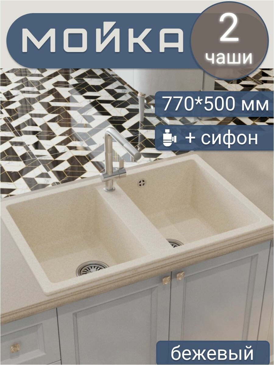 Мойка для кухни врезная прямоугольная, двухчашевая, двойная, из искусственного камня, цвет бежевый, 770*500*190 мм информация: