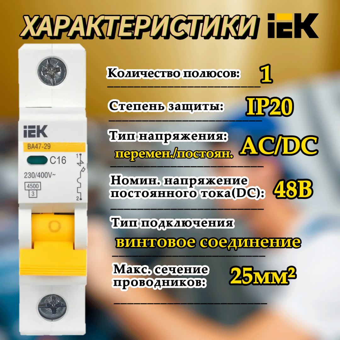 Выключатель автоматический IEK ВА47-29, 1Р, 16 А, 4,5 кА, тип С