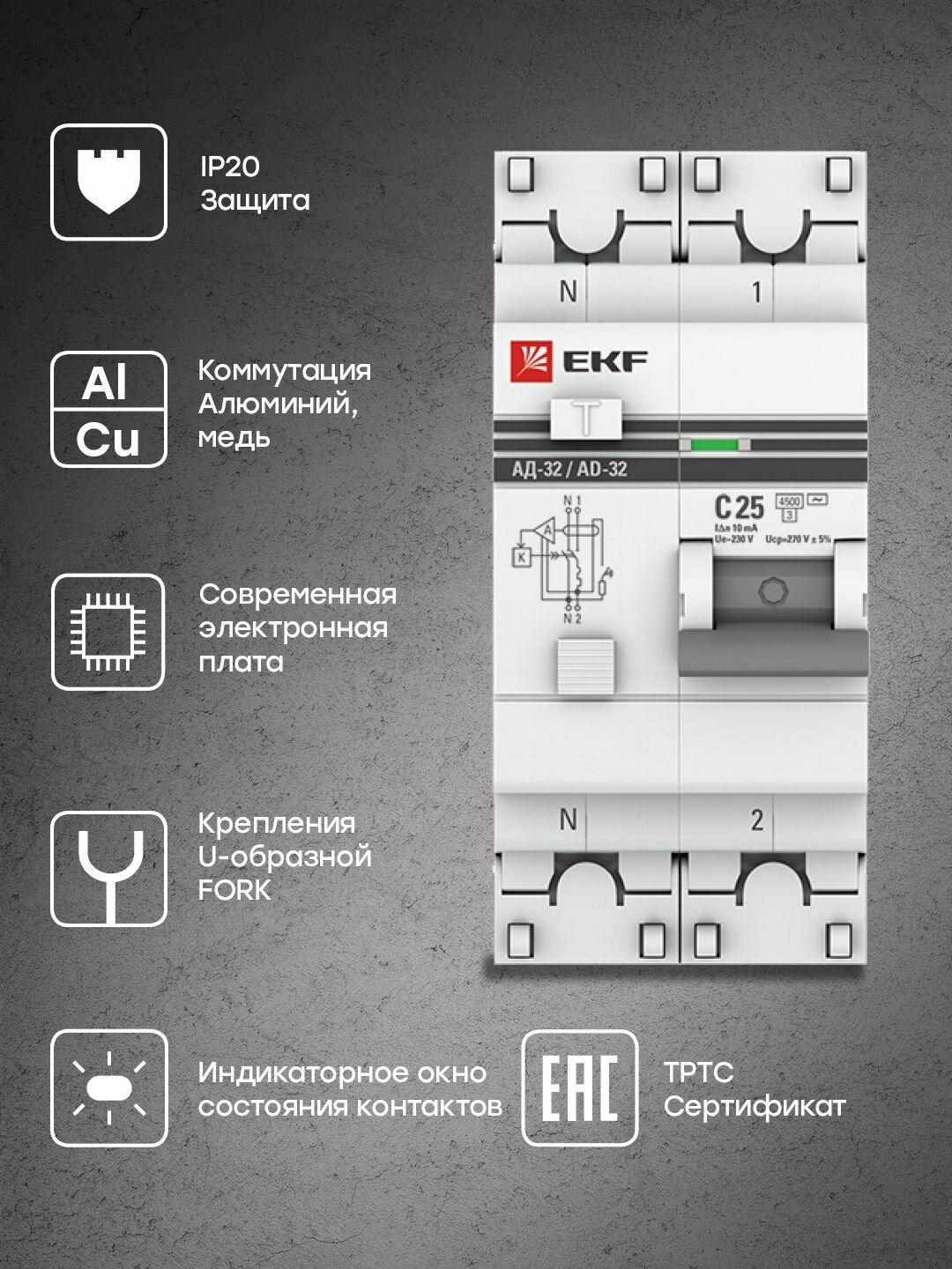 Дифференциальный автомат АД-32 1P-N 25А-10мА (хар. C, AC, электронный, защита 270В) 4,5кА EKF PROxima информация: