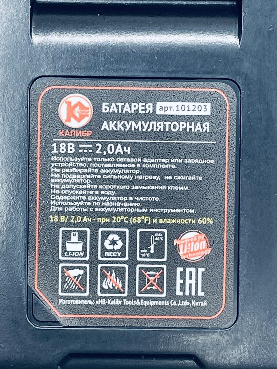 Акк.батарея Li-Ion для дрели "Калибр ДА-18-2А+" (18В, 2 Ач) 101203 00000076132 №607 информация: