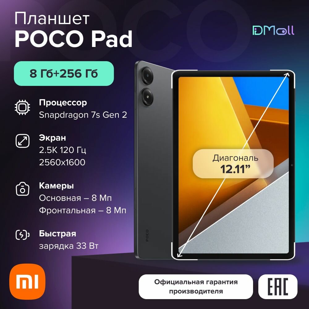 Планшет POCO Pad 8+256 N83P/Grey|12.11” IPS/120Hz/2560x1600/SD7sGen2/And14/8MP/8MP/microSD/10000mAh информация: