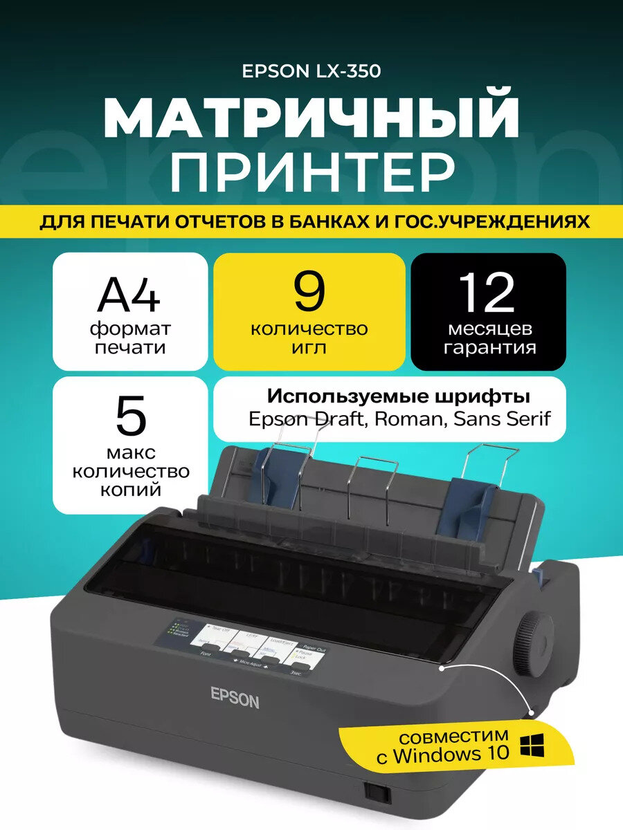 Мы выбрали 10 лучших цен на Матричный принтер Epson LX-350 USB, LPT, COM, 357 cps, 300x300 dpi (C11CC24032). Перед тем как купить Матричный принтер Epson LX-350 USB, LPT, COM, 357 cps, 300x300 dpi (C11CC24032) посмотрите найденные предложения из Яндекс Маркета и других сайтов на основе XML фидов.