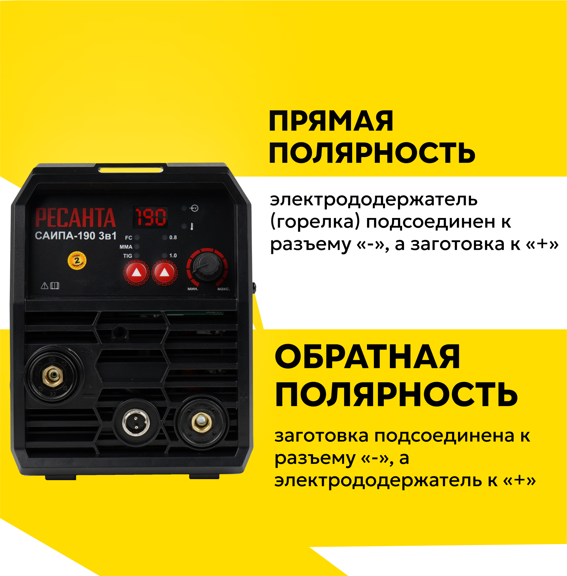 Сварочный инверторный полуавтомат без газа САИПА-190 Ресанта 3 в 1 (MMA, FCAW (Flux), TIG) информация:
