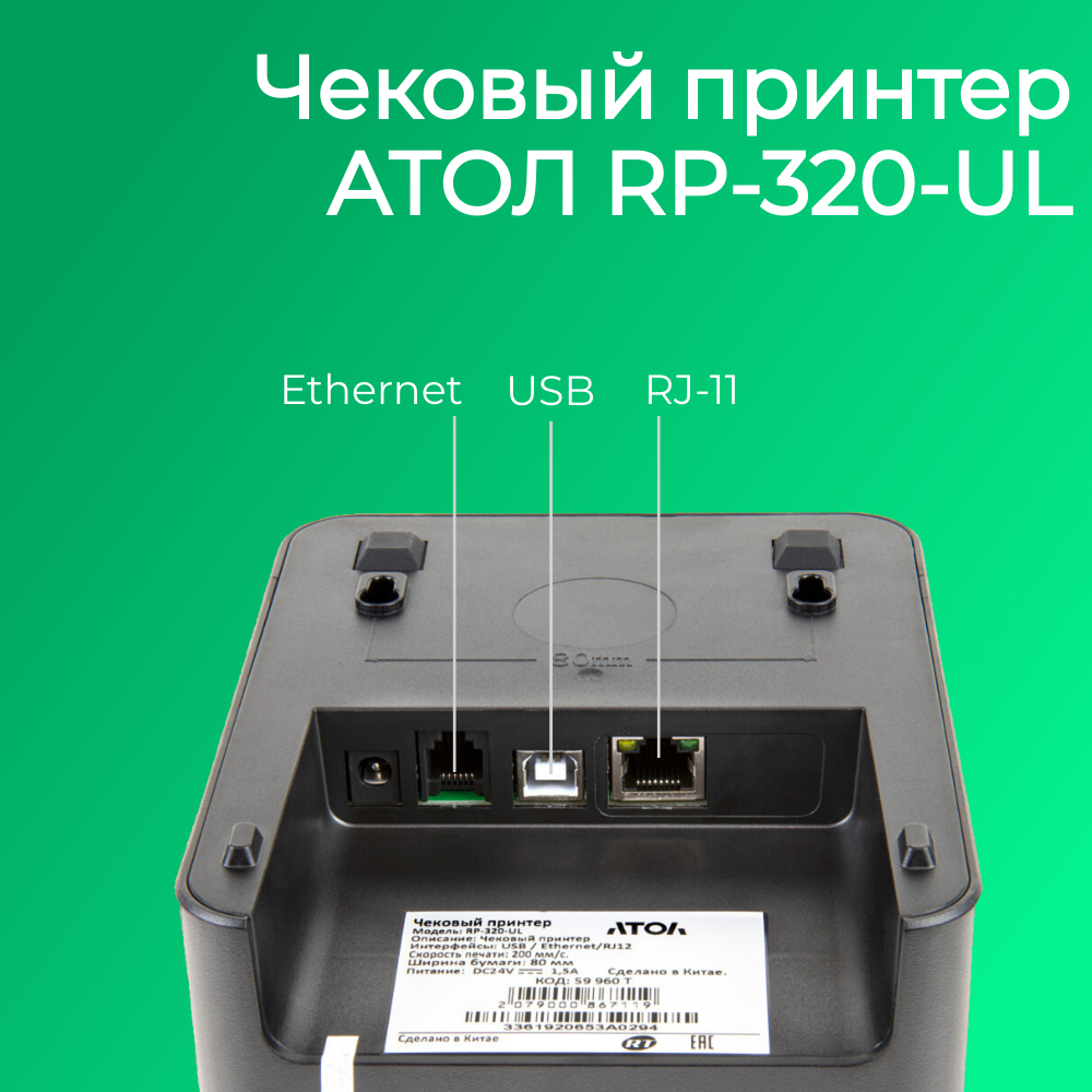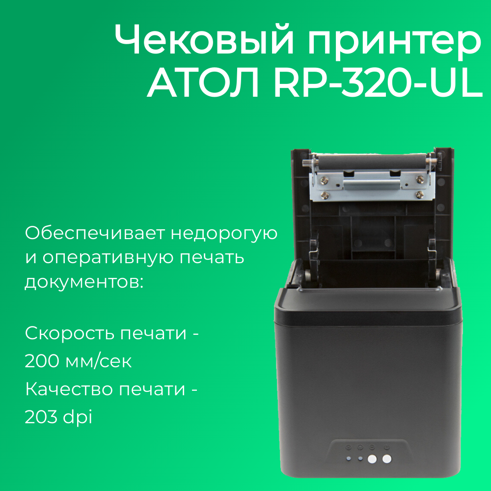 Чековый принтер АТОЛ RP-320-UL (черный, Ethernet, USB, RJ-11, ширина печати 80 мм, скорость печати 200 мм/сек) информация: