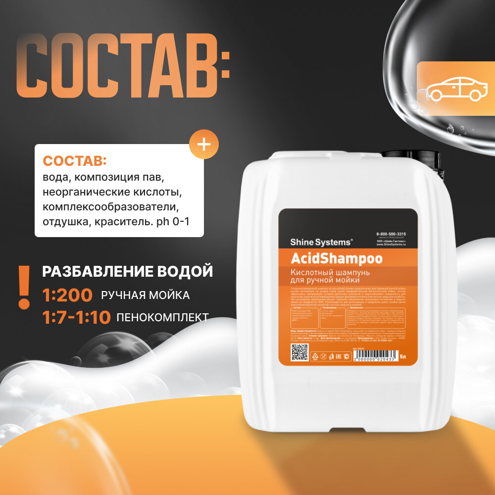 | Дополнительная информация | AcidShampoo - это кислотный шампунь для ручной мойки от Shine Systems, предназначенный для бережного ухода за кузовом автомобиля. Он эффективно нейтрализует остатки щелочных шампуней и подготавливает поверхность для нанесения защитных составов разного уровня. |