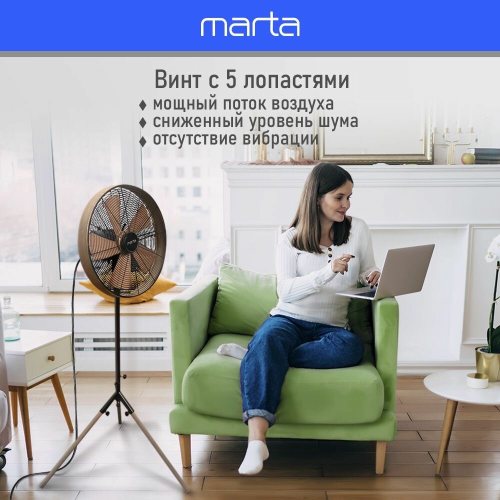 10 цен на Вентилятор напольный MARTA MT-FN2555 с уникальным дизайном, d40 см, высокая мощность, регулировка угла наклона, вращение, безопасная металлическая решетка, черный/дерево