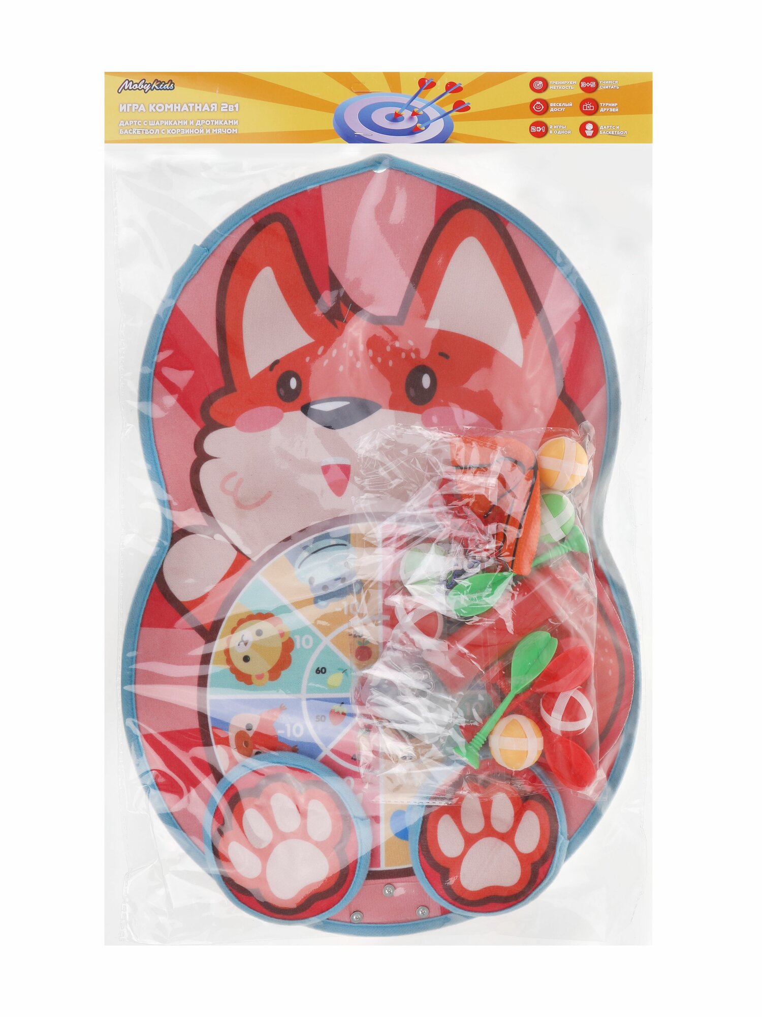 Игра комнатная ТМ "Moby Kids" Лисичка: Дартс с липучкой двусторонний 21 см. 2 в 1 с баскетбольным кольцом. 4 дротика и 6 шариков, мяч, насос в компл. информация: