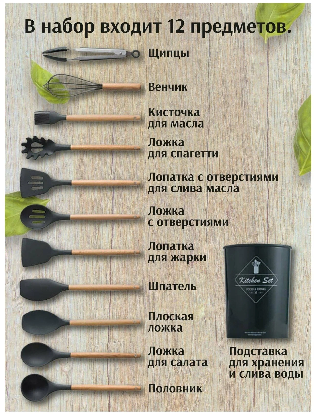 | Комплектация | половник, лопатка, лопатка с прорезями, кулинарная ложка, кулинарная ложка с прорезями, венчик, кисть, щипцы с жаропрочными наконечниками, ложка для спагетти, лопатка удлиненная овальная ( с прямым краем), кулинарный скребок-шпатель, ведерко для хранения кухонной утвари |