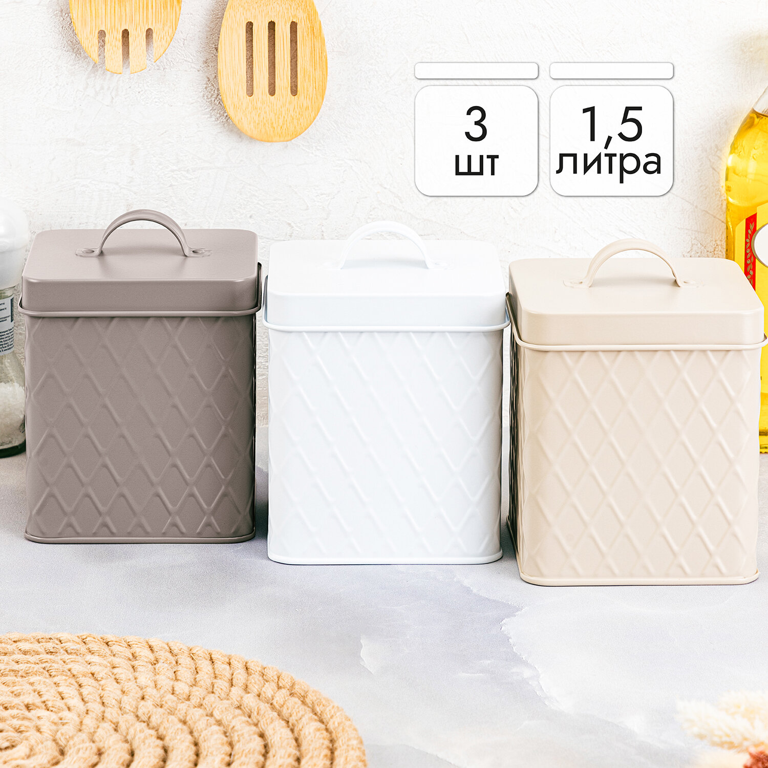 Банка для хранения сыпучих продуктов 3 шт 1,5 л Elan Gallery, с крышками, серая, бежевая, белая, набор информация: