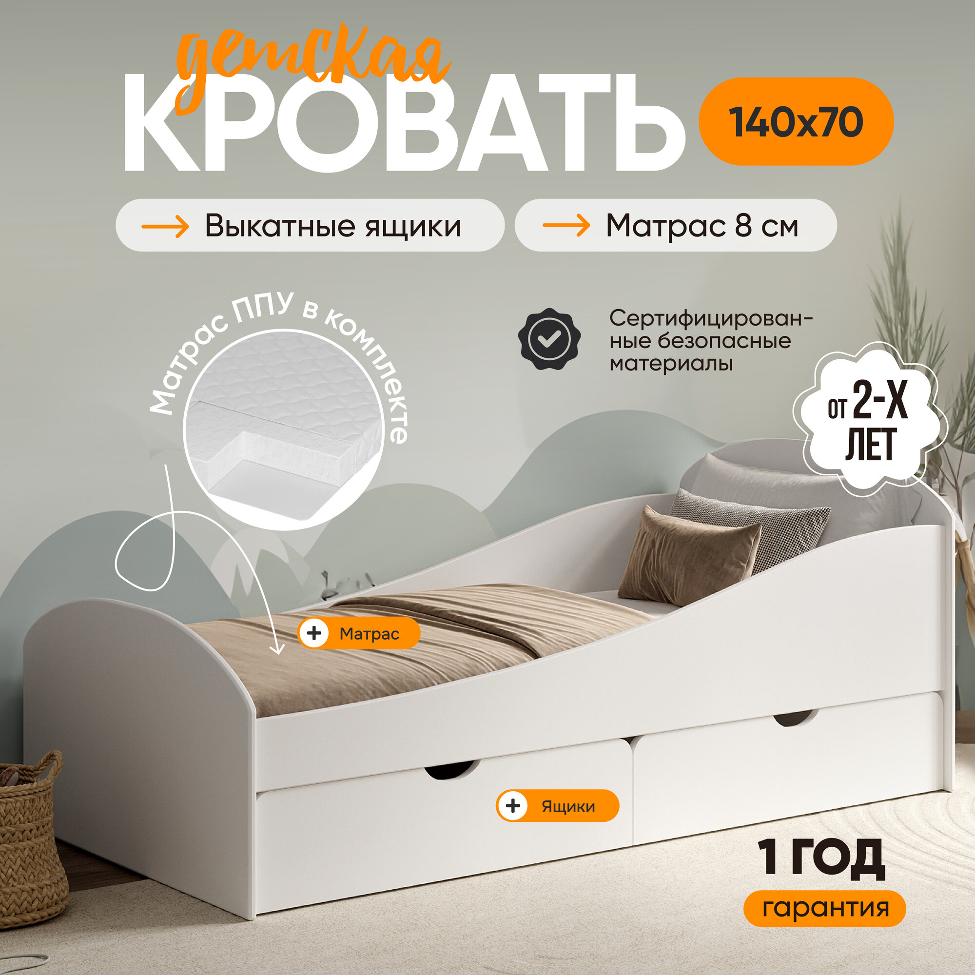 Отзывы на Кровать детская Volna с 2 ящиками и матрасом 140x70 см, цвет Белый, с защитными бортиками, кровать односпальная подростковая, тахта кровать