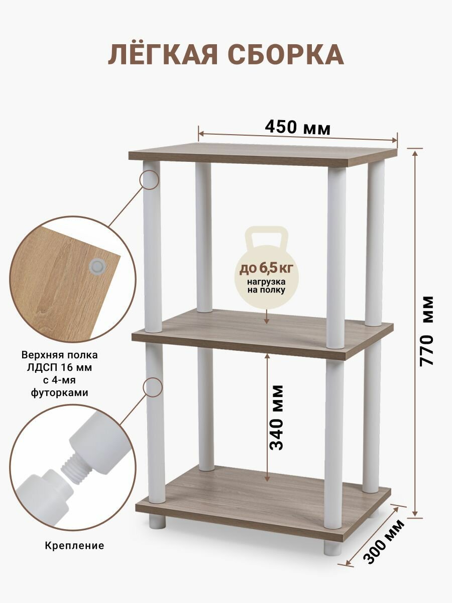 | Дополнительная информация | Полка ЛДСП с 4 футорками - 1 шт.; полка ЛДСП с 4 сквозными отверстиями - 2 шт.; стойка пластик - 8 шт.; ножка пластик - 4 шт.; инструкция по сборке |