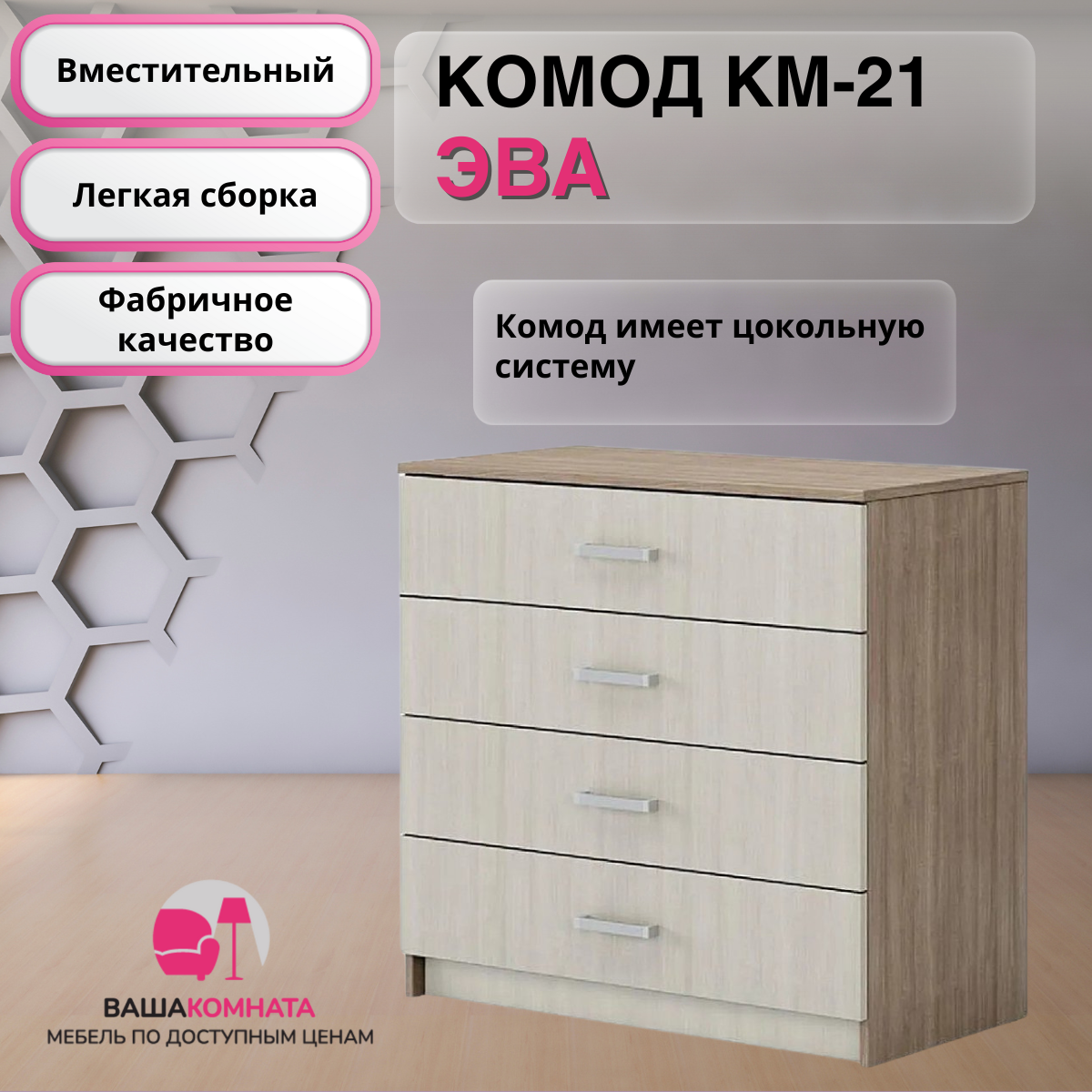 Отзывы на Комод ЭВА КМ-021, 82х85х44,5 см, 4 ящика, ЛДСП, ясень шимо темный/ясень шимо светлый, МебельТИ