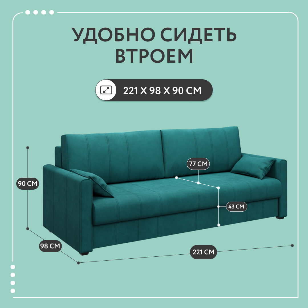 Диван-кровать раскладной прямой Dee One Римини, еврокнижка, велюр, 221х98х90, изумрудный информация: