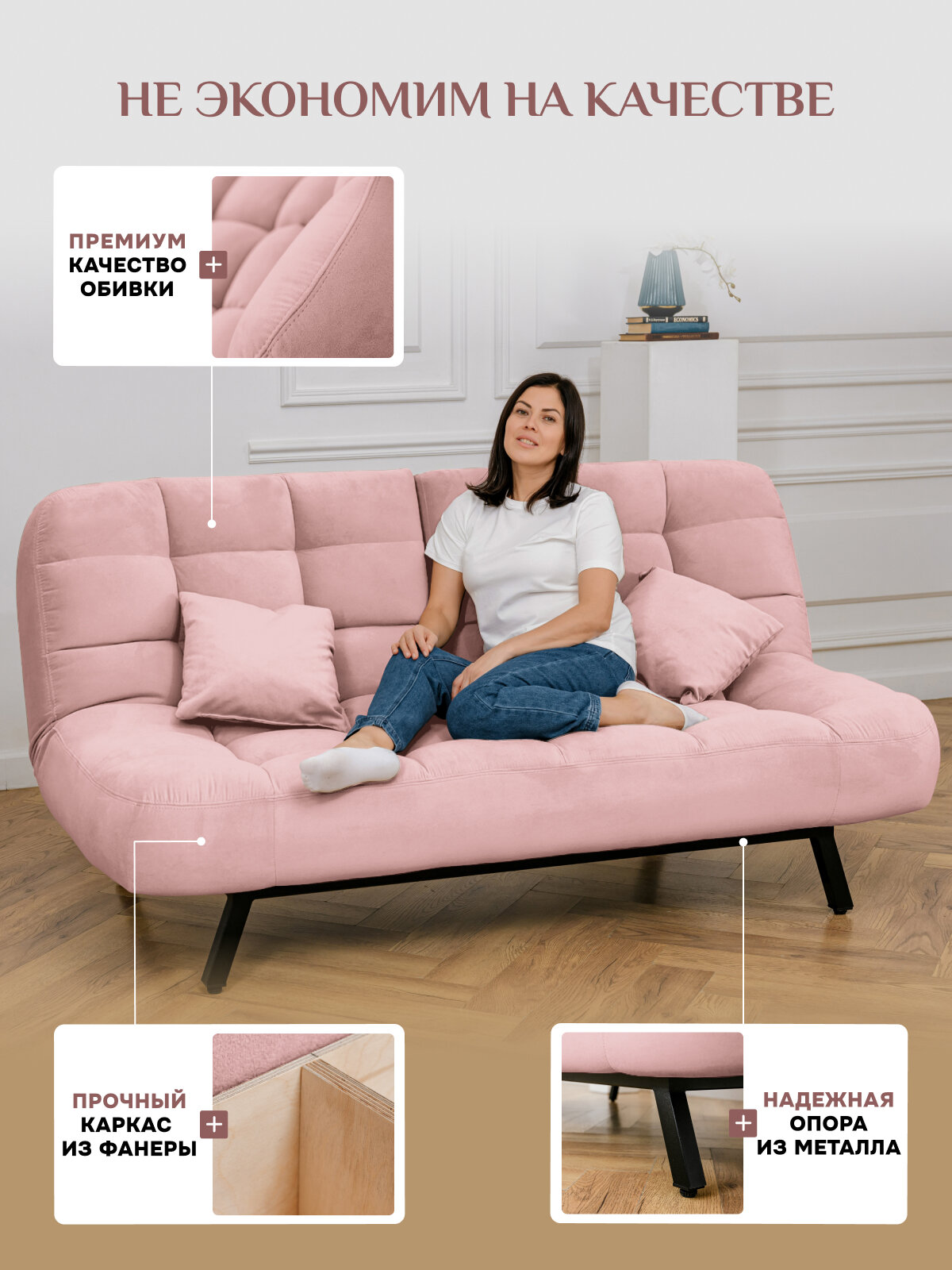 Отзывы на Диван-кровать Brendoss 304, прямой диван раскладной с двойной спинкой, клик-кляк, антивандальный велюр, цвет розовый