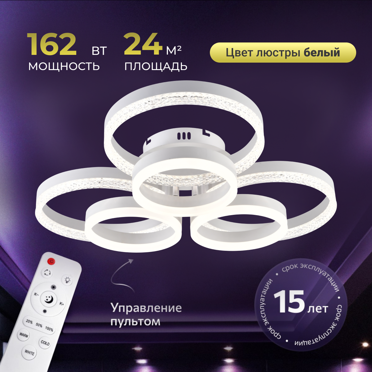 Отзывы на Люстра с пультом светодиодная потолочная 162W, кольца, большая, белая, LEDCITY