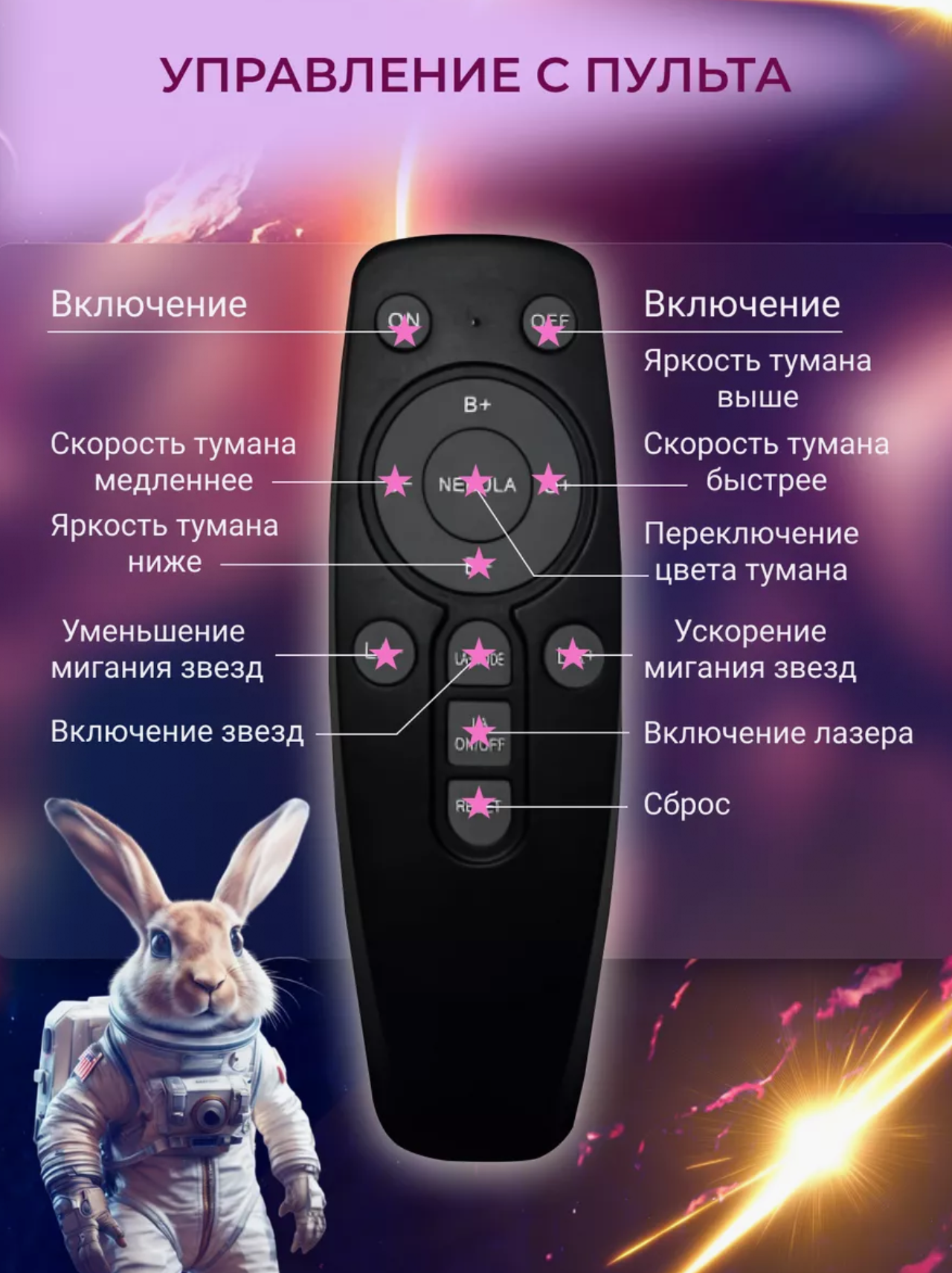 | Комплектация | Светильник-проектор звездного неба, Космонавт, пуль ДУ , Шнур USB, Инструкция |