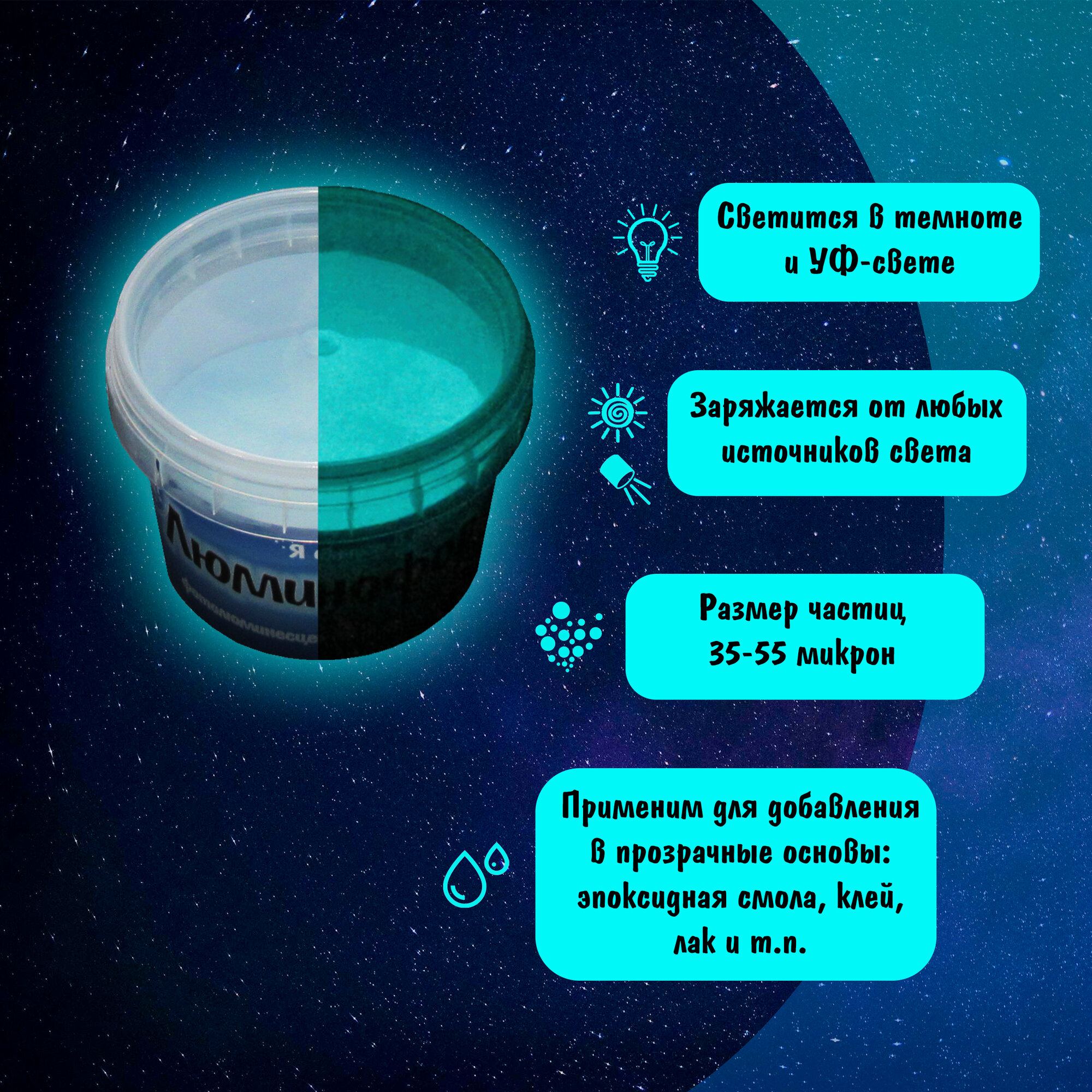 Отзывы на Люминофор (Фотолюминесцентный пигмент), цвет Голубой, свечение Голубое, 100 гр.