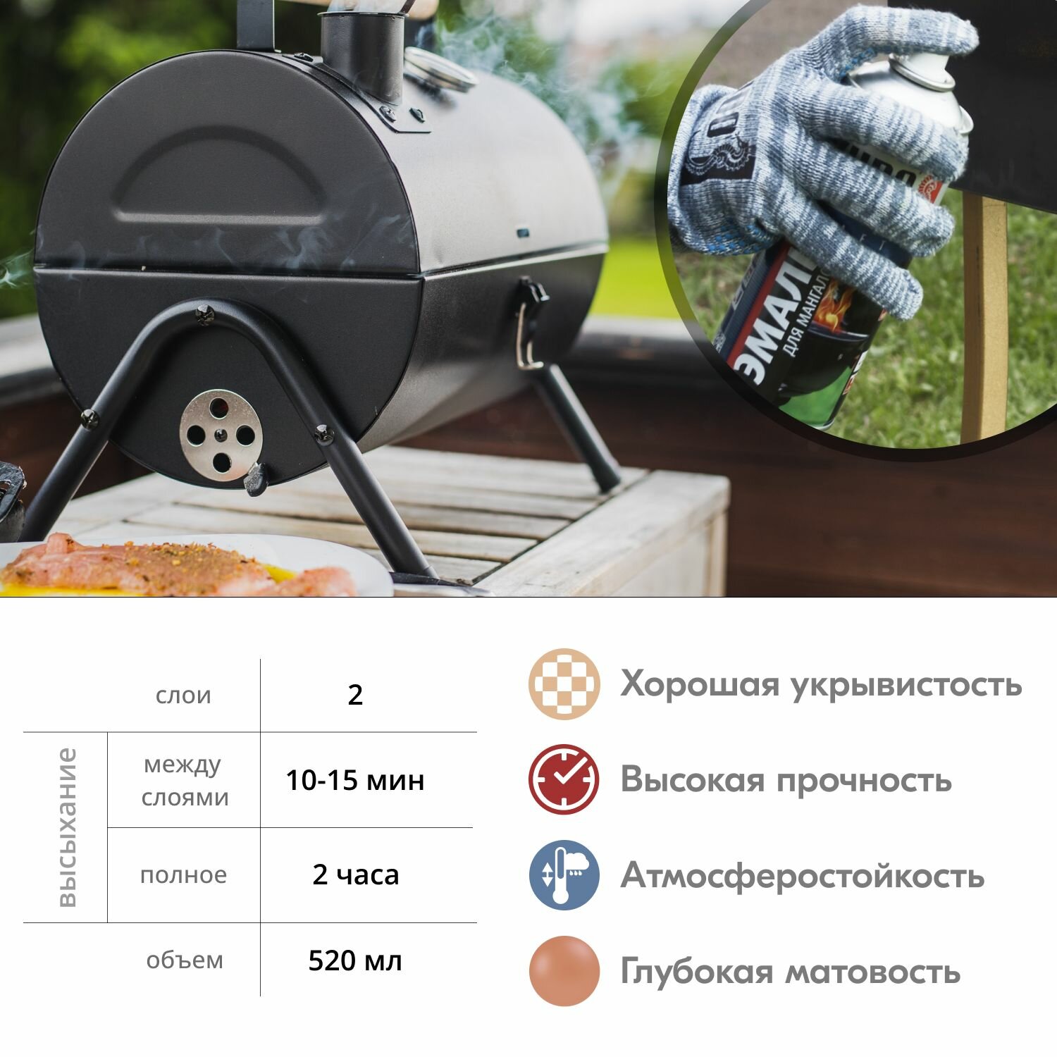 | Дополнительная информация | не грунтовать; запрещается окрашивать горячие поверхности или детали; при окраске изделий для приготовления пищи окрашивать только внешние поверхности; при первом использовании мангала выделяются дым и запах, которые в дальнейшем не выделяются |