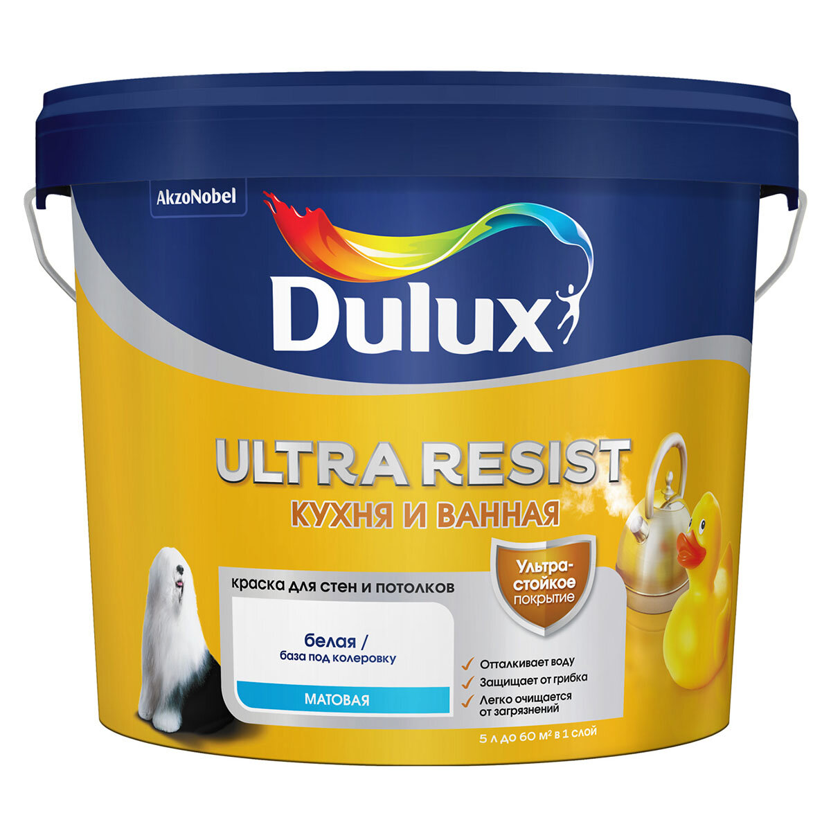 Краска Dulux Ultra Resist Кухня и Ванная для стен и потолков база BW матовая 5 л