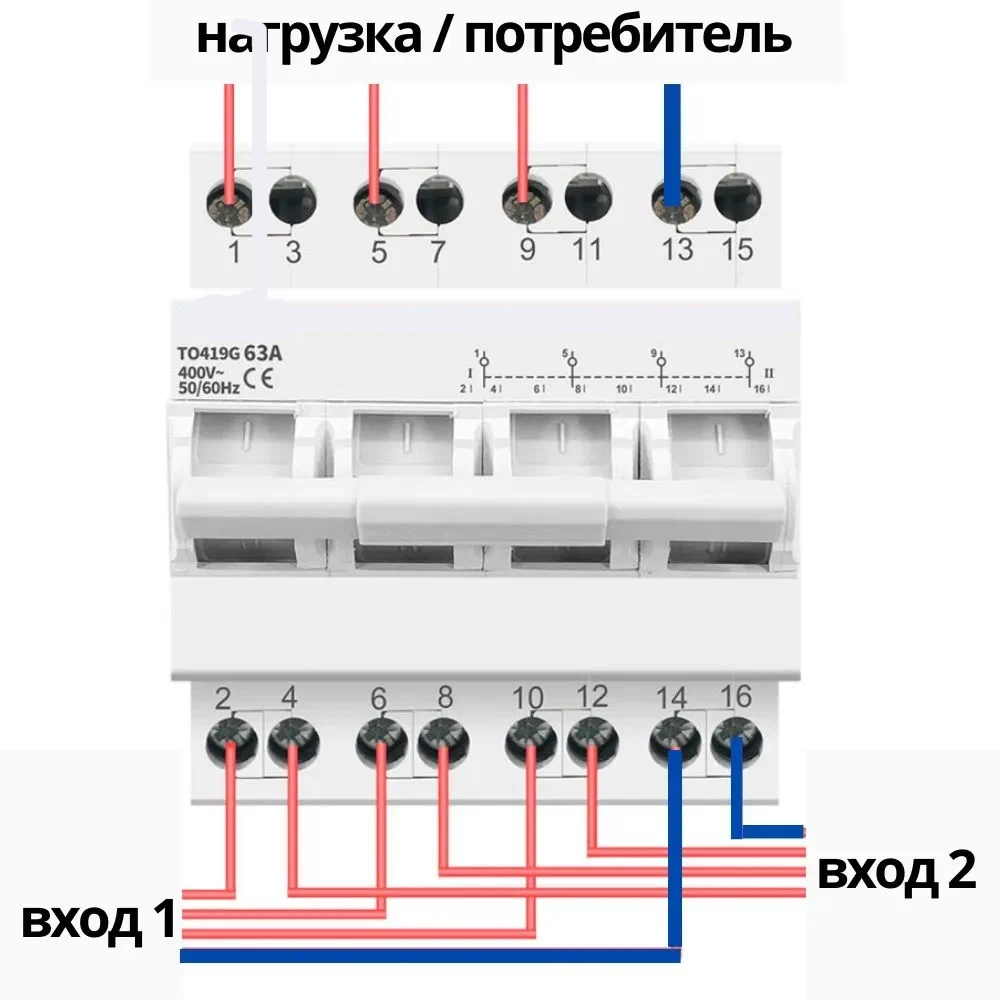 Трехпозиционный переключатель, 4p, 63А, 4 полюса, модульный перекидной, рубильник реверсивный, 2 источника питания, на din-рейку 1 373 ₽