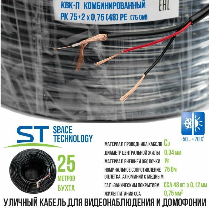 Кабель комбинированный для видеонаблюдения и домофонии КВК-П 2Х0,75 (РК 75+2х0,75 (48) PE ST) черный для внешней прокладки (улица) (бухта 25м) информация: