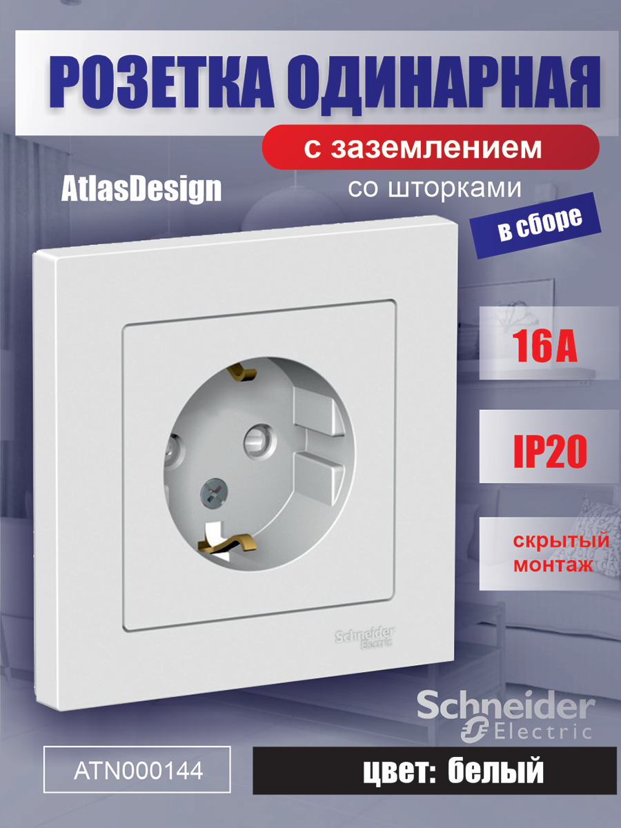 Розетка Schneider Electric ATN000145 AtlasDesign, 16 А, с защитной шторкой, с заземлением