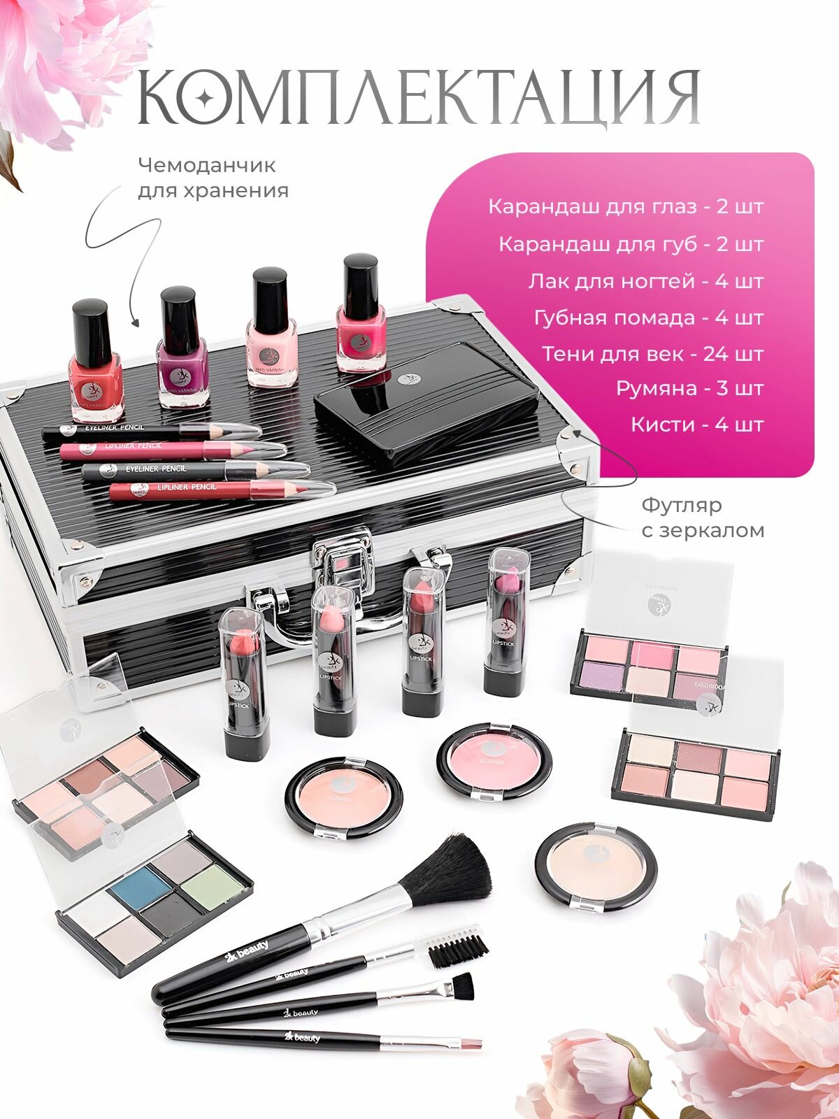 | В наборе | тени для век 24 оттенка, 4 оттенка помады для губ, 2 оттенка румян, хайлайтер, 2 карандаша для губ, 2 карандаша для глаз, лак для ногтей 4 цвета, кисть для румян, кисть для теней, расческа для бровей, кисть для губ, кейс для теней с зеркалом, косметический чемоданчик |