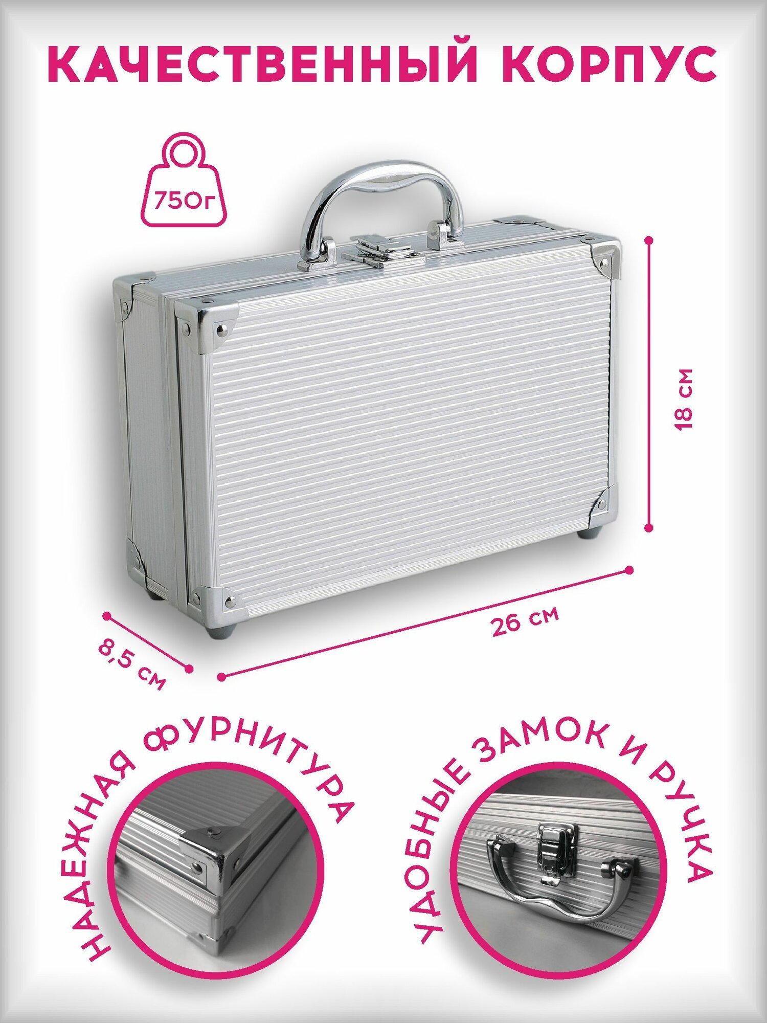 | В наборе | 24 оттенка теней, 2 цвета румян, 2 оттенка помады, 2 бальзама для губ, 2 лака для ногтей, набор кисточек для макияжа лица, глаз и губ, косметический чемоданчик |
