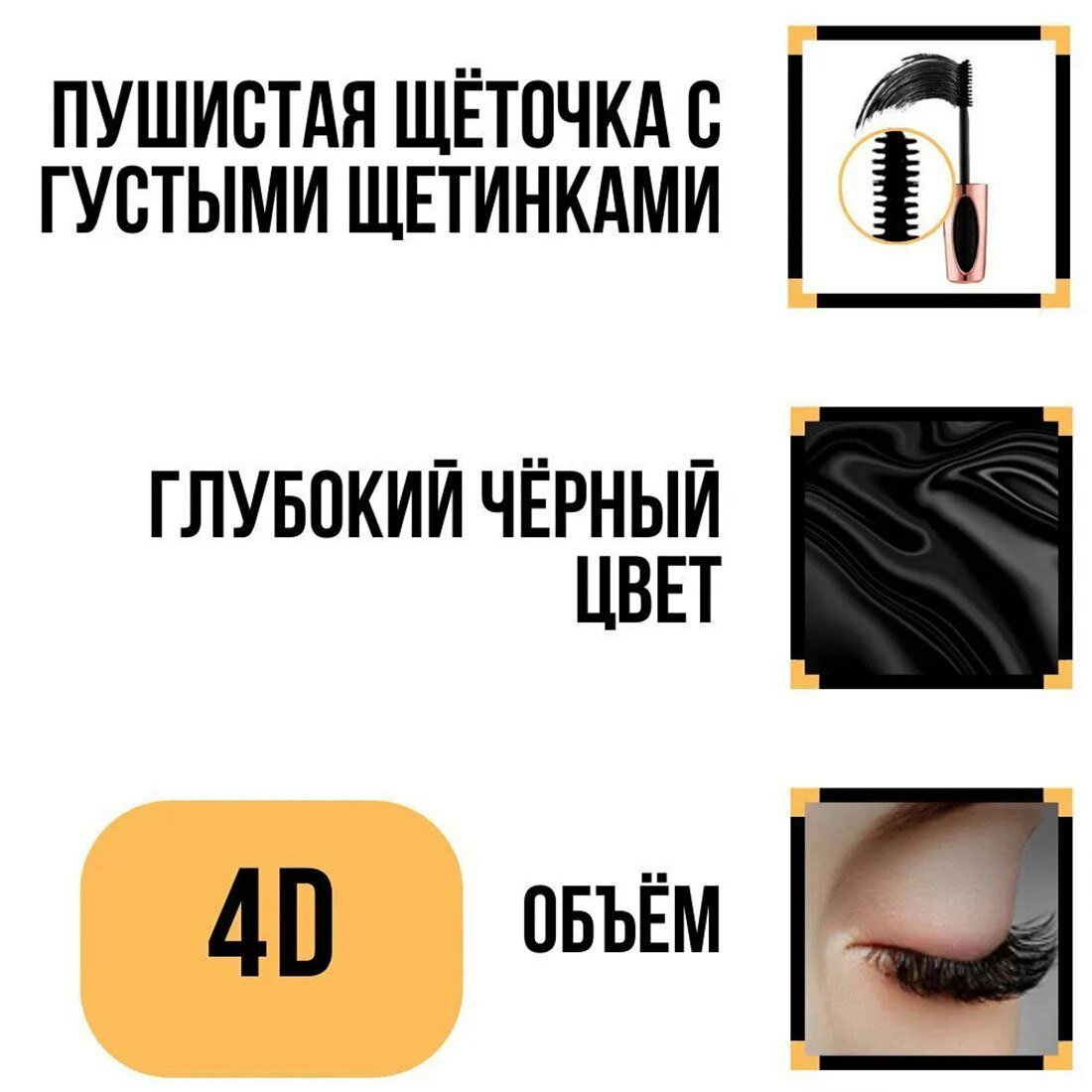 | Эффект | подкручивание / придание объема / разделение / удлинение / усиление роста ресниц / эффект накладных ресниц |