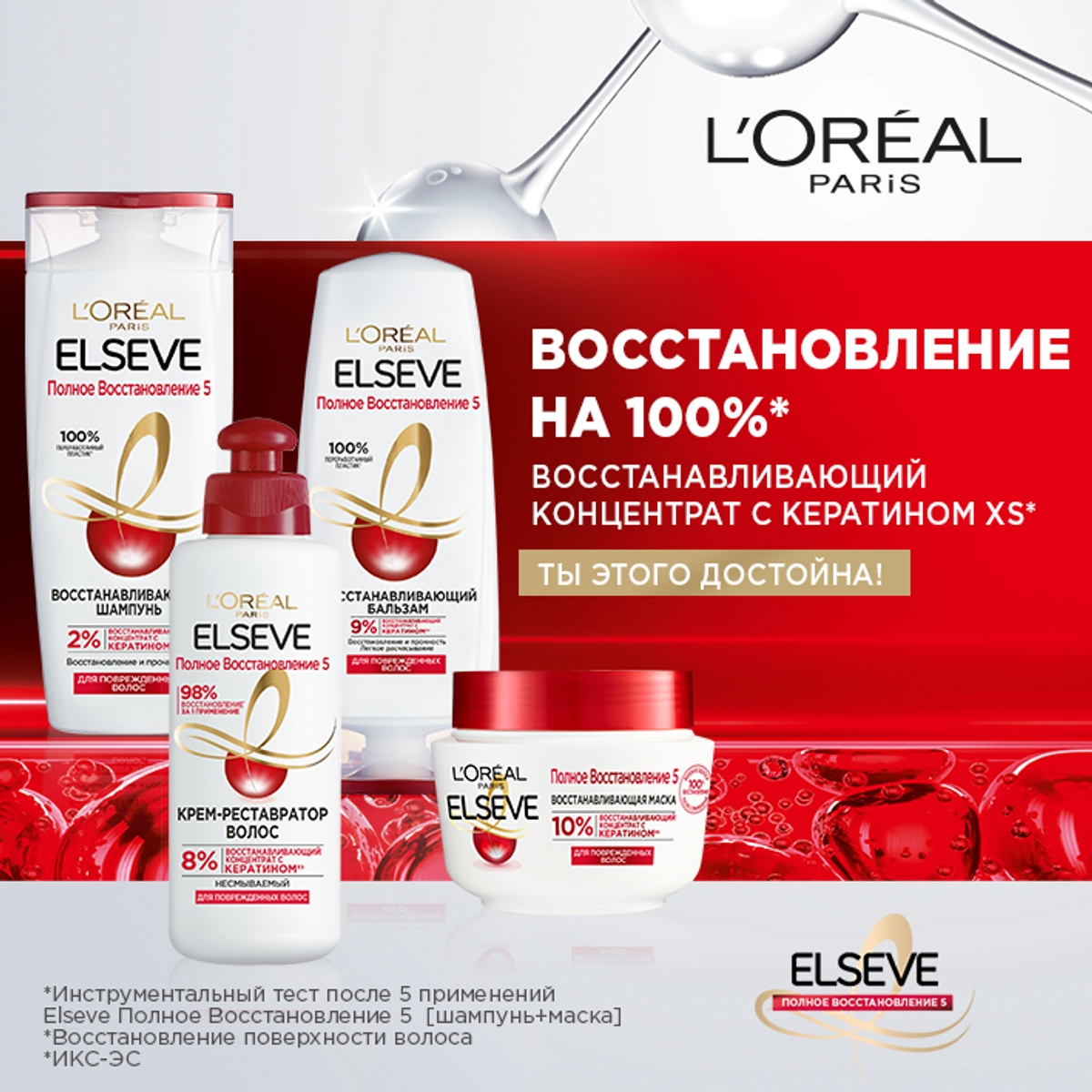L'Oreal Paris Шампунь Elseve Полное Восстановление 5 2% концентрат с кератином для поврежденных волос, 250 мл - 3 шт 1 351 ₽